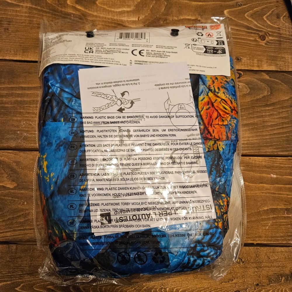 Adult inflatable “Ride a Raptor” dinosaur costume. Brand new and factory sealed in original packaging. This fun inflatable costume gives the illusion that you are riding a blue raptor dinosaur. Perfect for Halloween parties, costume events, cosplay, parades, or themed celebrations. Features: Adult one size fits most Inflatable dinosaur raptor design Includes battery-operated air pump Lightweight and easy to wear Fun, eye-catching novelty costume Includes: Inflatable costume Battery-operated air pump Instructions Note: Requires 4 AA batteries (not included). Not recommended for children under 3 years due to small parts. Condition: New / Sealed (Only opened to confirm contents) Ships fast and carefully packed from a smoke-free environment.