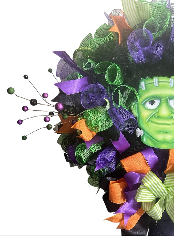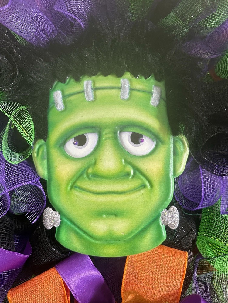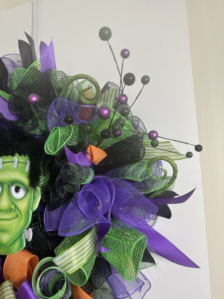 This Frankenstein Wreath is large and in charge! Length: 44” Width: 31” Depth: 18”. perfect for Halloween. Colors of green, purple, black and a touch of orange. The Frankenstein metal head has been adorned with fur hair, flocked and glittered stitches, purple rhinestones for the gleam in his eyes, and glittered screws in his neck.
