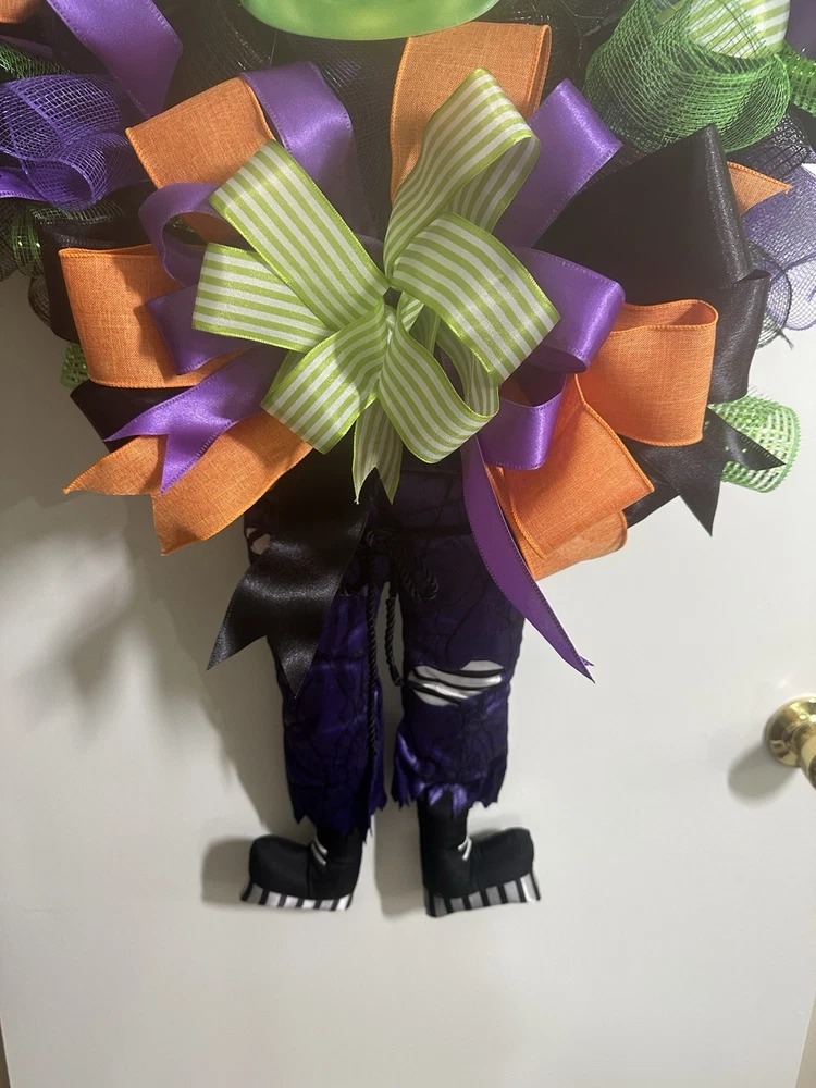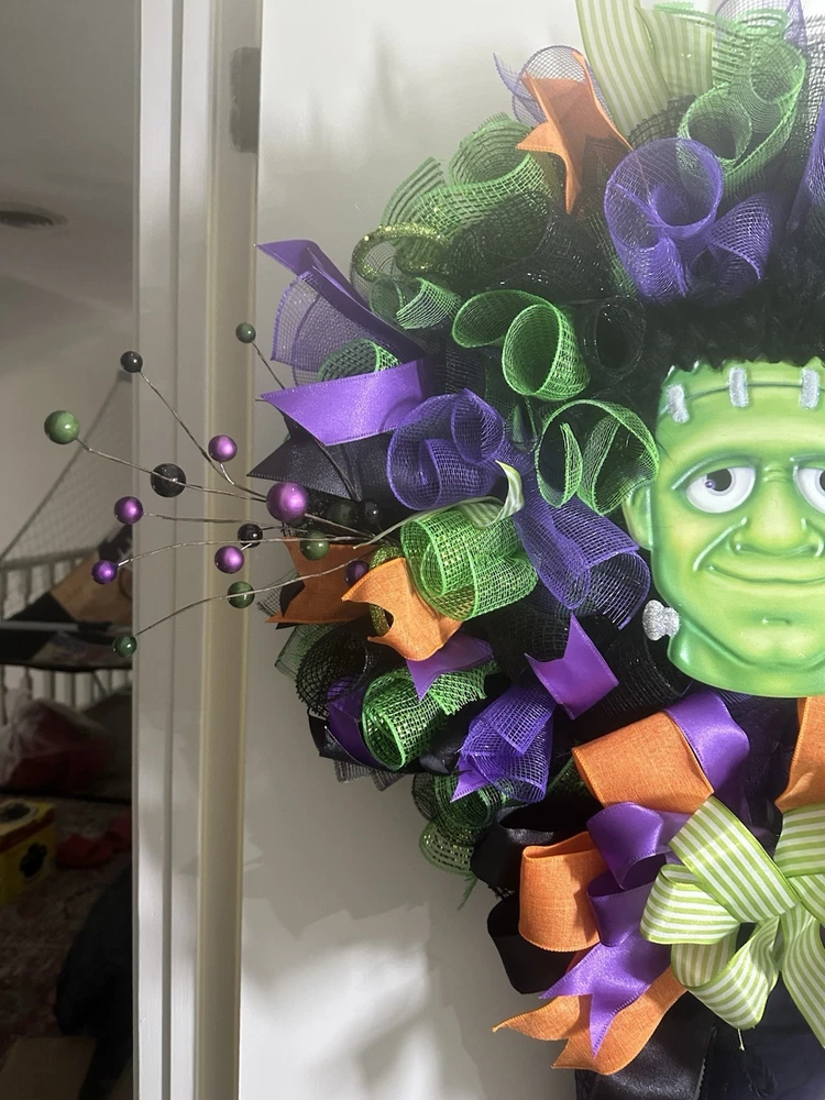 This Frankenstein wreath is a showstopper! The bold colors and fun details like the glittered stitches and rhinestone eyes make it pop. Big, eye-catching, and perfect for Halloween—it instantly adds spooky charm to any front door. The mix of textures and playful design really brings Frankenstein to life. Loveackingle!