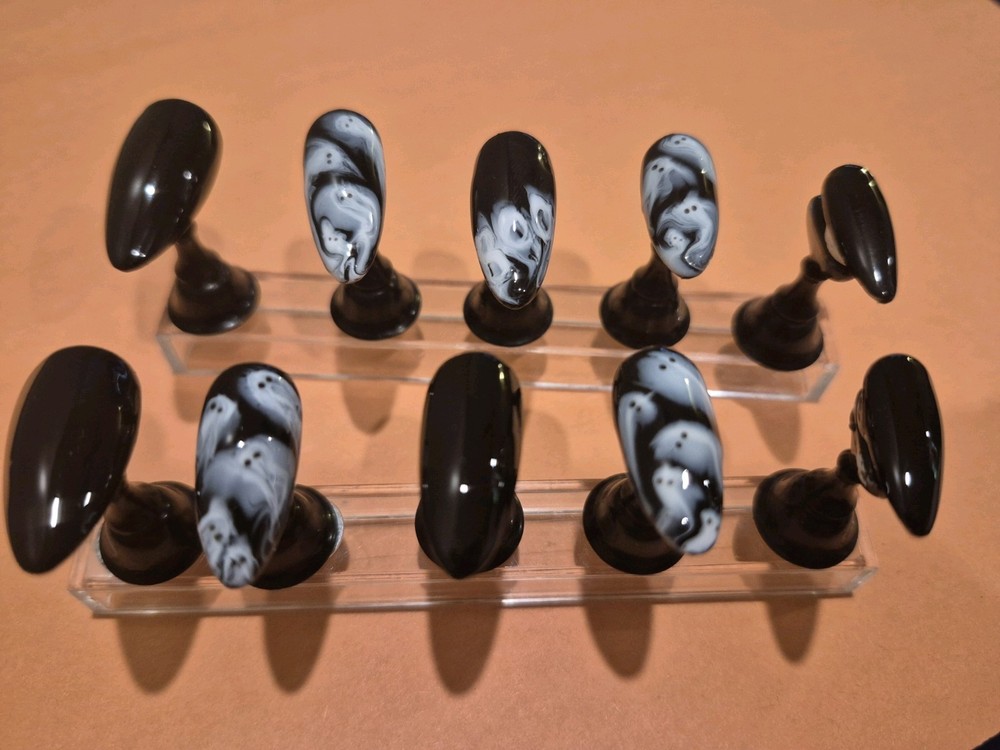 These Halloween Ghost Press-On Nails are perfect for adding a spooky touch to your nails! This set is a size LARGE and comes in a medium-almond shape. Get ready to rock some ghostly nails for the Halloween season!