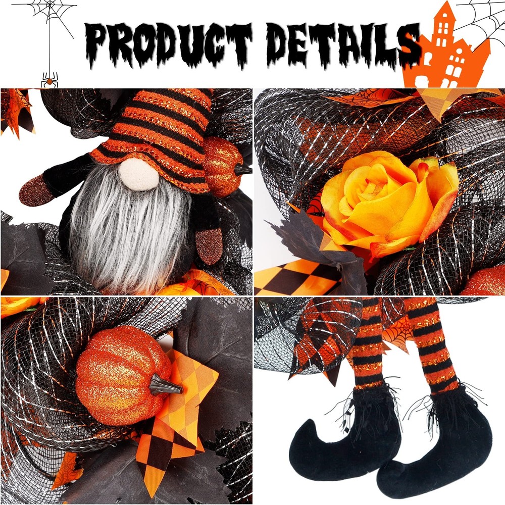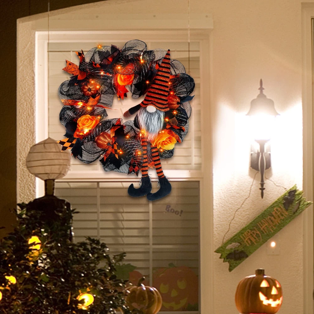 Halloween Wreath for Front Door, Halloween Gnome Outdoor Lighted Decorative Wreath 🧡 PREMIUM MATERIAL: This Halloween wreath are made of quality plastic and soft fabric, lightweight and easy to hang, each Halloween wreath decoration is carefully handcrafted, details may be different, but the whole is similar to the picture, each wreath is beautiful and unique. 🖤 LIGHTED HALLOWEEN WREATH: This Halloween wreaths for front door will come with 30 led copper string lights, powered by 2AAA batteries(not included), you can wrap the lights around the wreath according to your needs, it will emit an orange lights, helps to add more horrifying atmosphere to your Halloween decor. 🎃 HAPPY HALLOWEEN: This Halloween gnome wreath are designed with artificial black maple leaves, soft fabric gnome, orange power coated pumpkins, faux roses, black woven mesh with silver thread embellishment, rhombus printing and spider web printing ribbons, vivid colorful and unique design will become a beautiful landscape and make a big difference in your house 🚪 VERSATILE USE: The 17" front door wreath is sure to be an attractive addition for Halloween indoor and outdoor decoration! Hang it on the front door, living room, fireplace, cabinets, walls, windows, shelves or any other places to get more Halloween atmosphere. If it is outdoors, it is recommended to hang it on the covered porch to avoid direct sunlight and rain. 🏰 HALLOWEEN PARTY DECORATIONS: Black and orange wreath is the perfect mix between spooky and chic, use this Halloween wreath as a party decoration or a door decoration to invite your friends to join the crazy Halloween party! This wreath door ornament is perfect for Halloween wall decorations, Halloween door decorations, Halloween window decorations, Halloween party favors, spooky party favors, Halloween photo props and more!