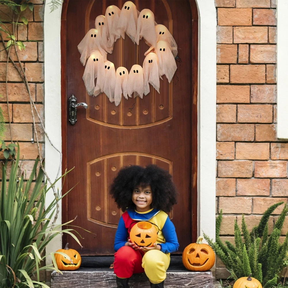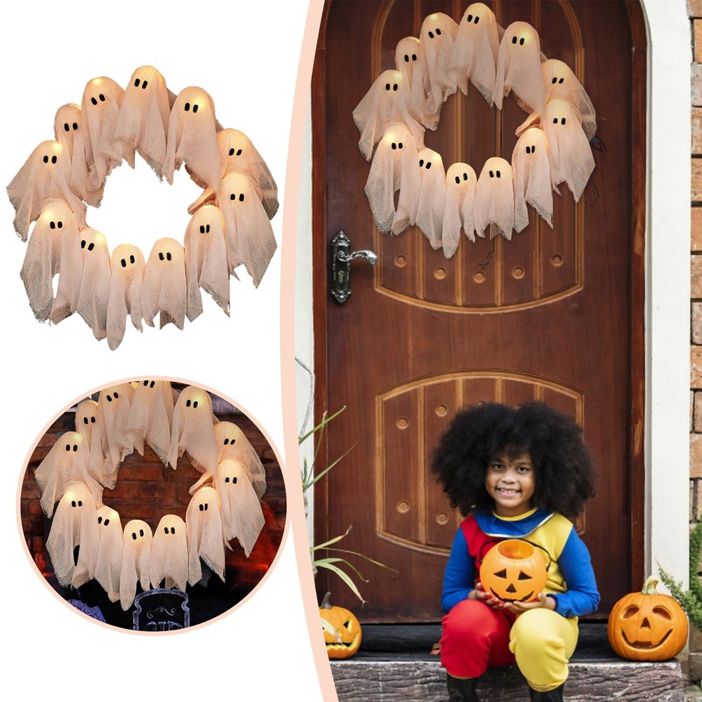 Spooky LED Ghost Wreath for Halloween Door and Wall Decor 16 Inch