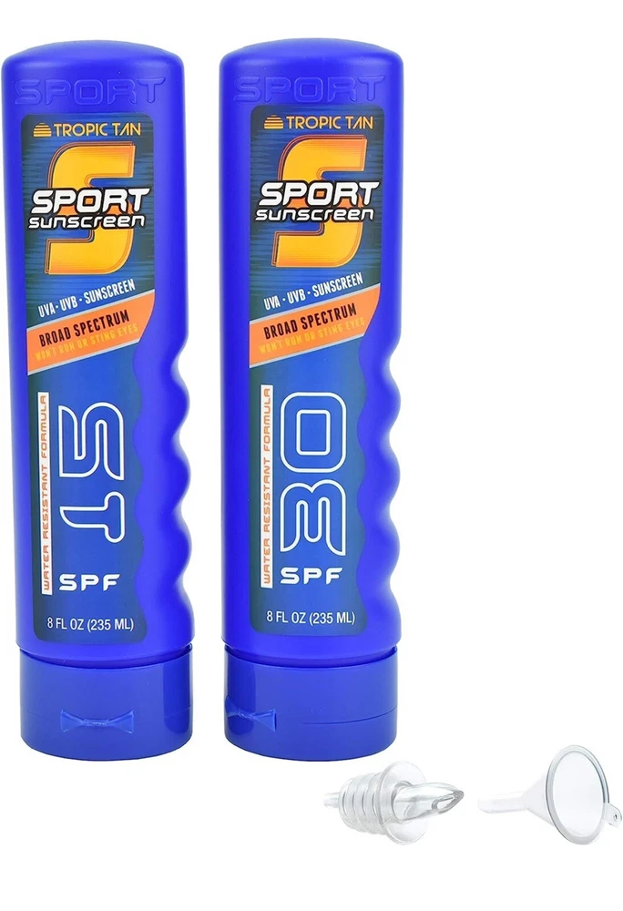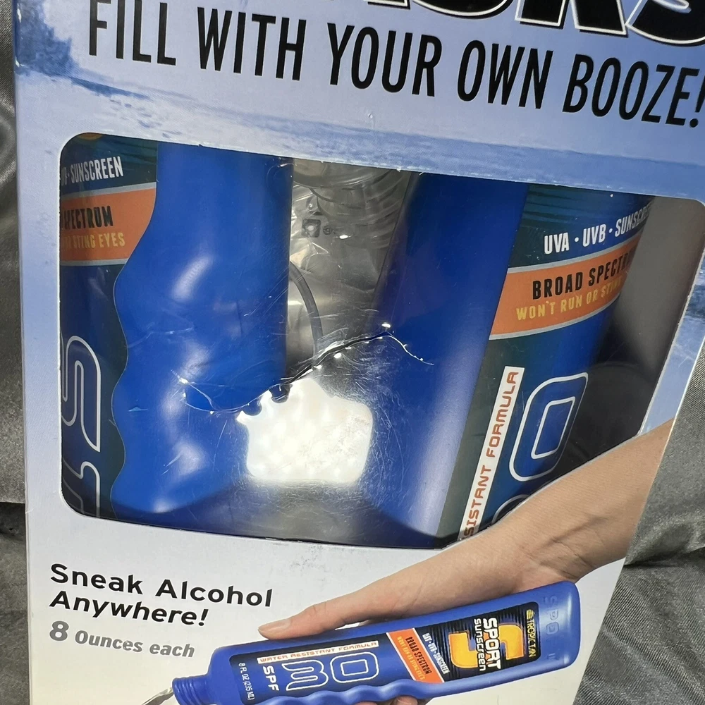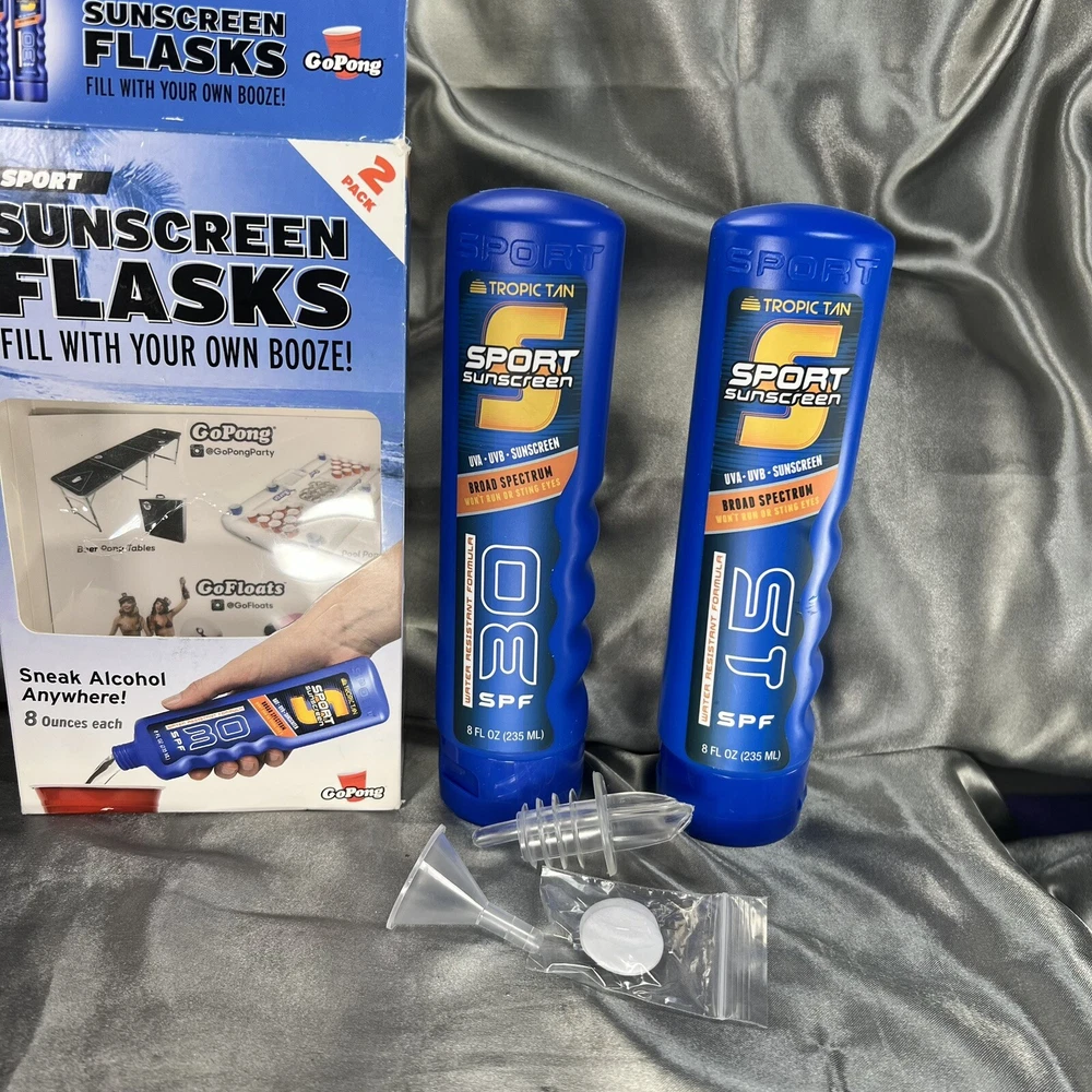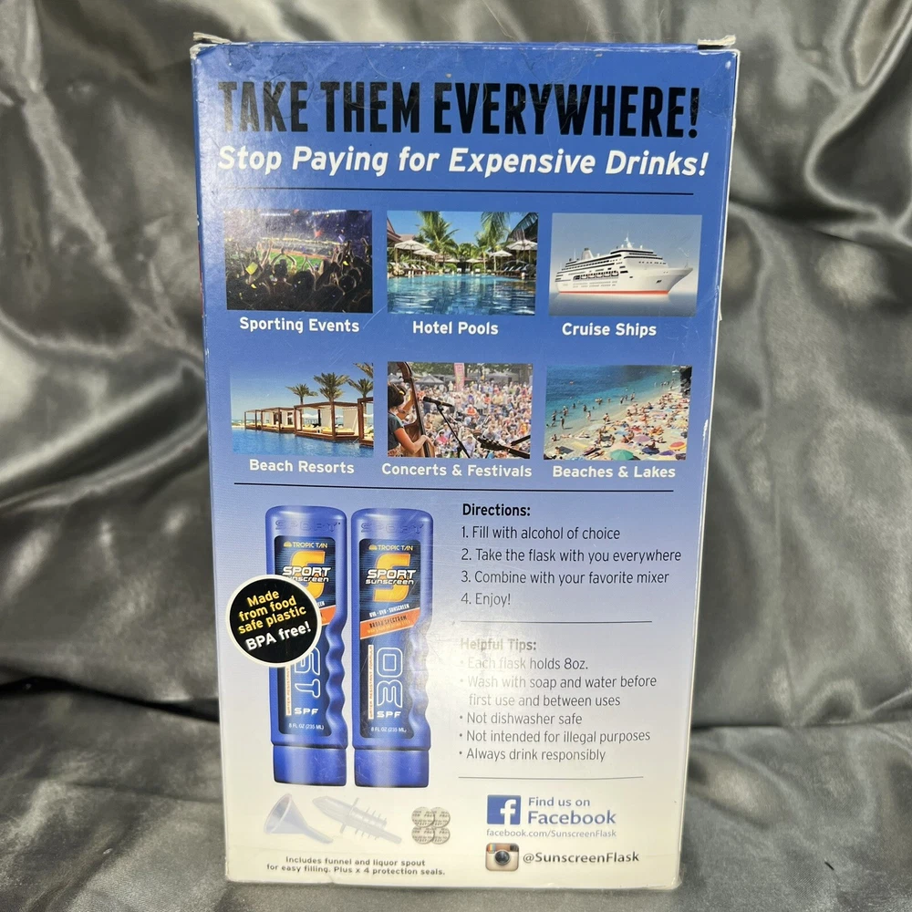New, box is damaged as seen in photos Everything included! 16 OUNCES TOTAL: Includes 2 convincing sunscreen flasks that hold 8oz each, which equals 10 shots total SAVE YOUR SPENDING MONEY: Perfect for a day out with friends, cruises, festivals, beach days, theme parks, and more UNIQUE DESIGNS: 15 SPF and 30 SPF sunscreen bottle designs make it easy to fool security so you can take your flask virtually anywhere EASY FILLING: Includes mess-free funnel so you can easily fill flasks with your favorite drinks FOOD GRADE PLASTIC: Made from food safe materials, always wash before using Ships within 24/hrs!