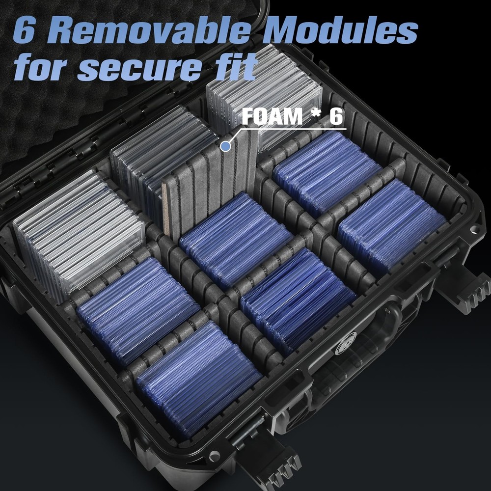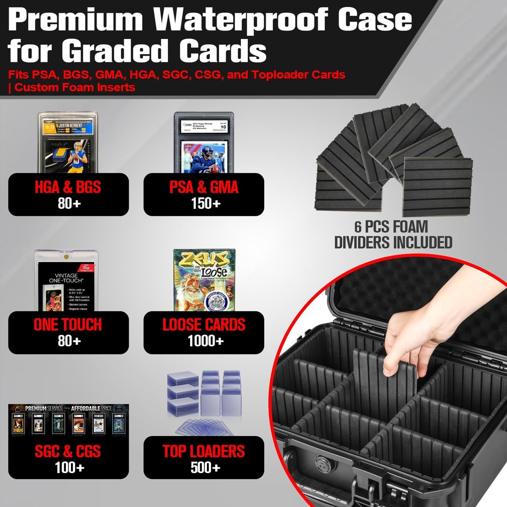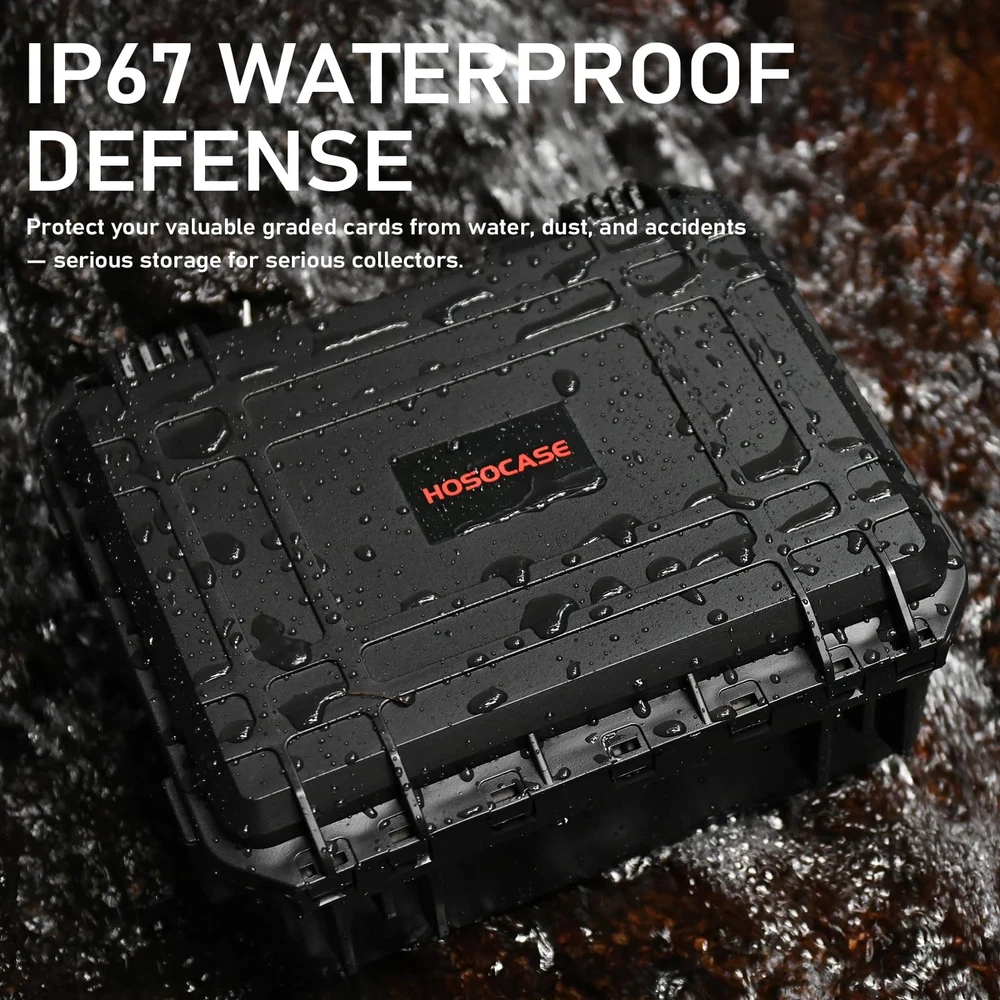 Sports Card Case Storage Box: Trading Cards Box for PSA Graded Medium Product Details [Versatile Storage for All Graded Card Types]: This premium card storage box is perfect for a wide range of cards (500+) , including graded cards (PSA, GMA, BGS, HGA, SGC, and CSG), Toploaders, magnetic cards, and more. It accommodates sports cards, game cards, and even gaming or collectible cards, making it an excellent trading card storage solution [Trading Card Case Customizable Design]: Designed with ample space, this graded card storage box can securely hold hundreds of cards. It features 6 removable dividers, allowing for a fully adjustable interior to fit your needs—perfect for organizing your sports card case, travel carry case, or even a playing card case [Baseball Card Storage Box with Durable Construction]: Built from high-quality PP material, this graded card case is impact-resistant and offers outstanding protection. Whether you’re storing baseball cards, trading card cases, or other valuable collectibles, the sturdy construction ensures your cards remain safe from damage [IP67 Waterproof for Sports Card Case ]: With an IP67 rating, this hard case with foam keeps your card display case free from water, dust, and debris. It’s the ideal solution for preserving the condition of your collectibles, such as game card cases and sports card cases, even in challenging environments