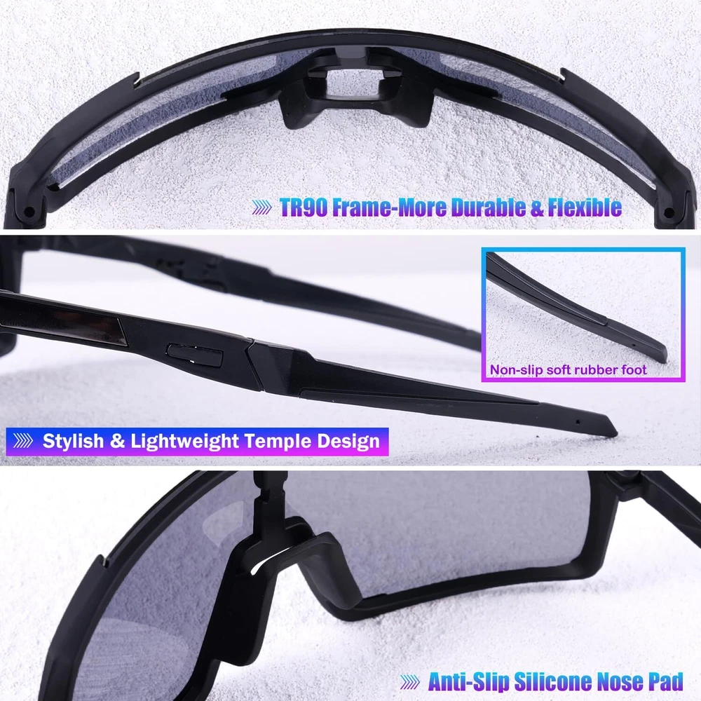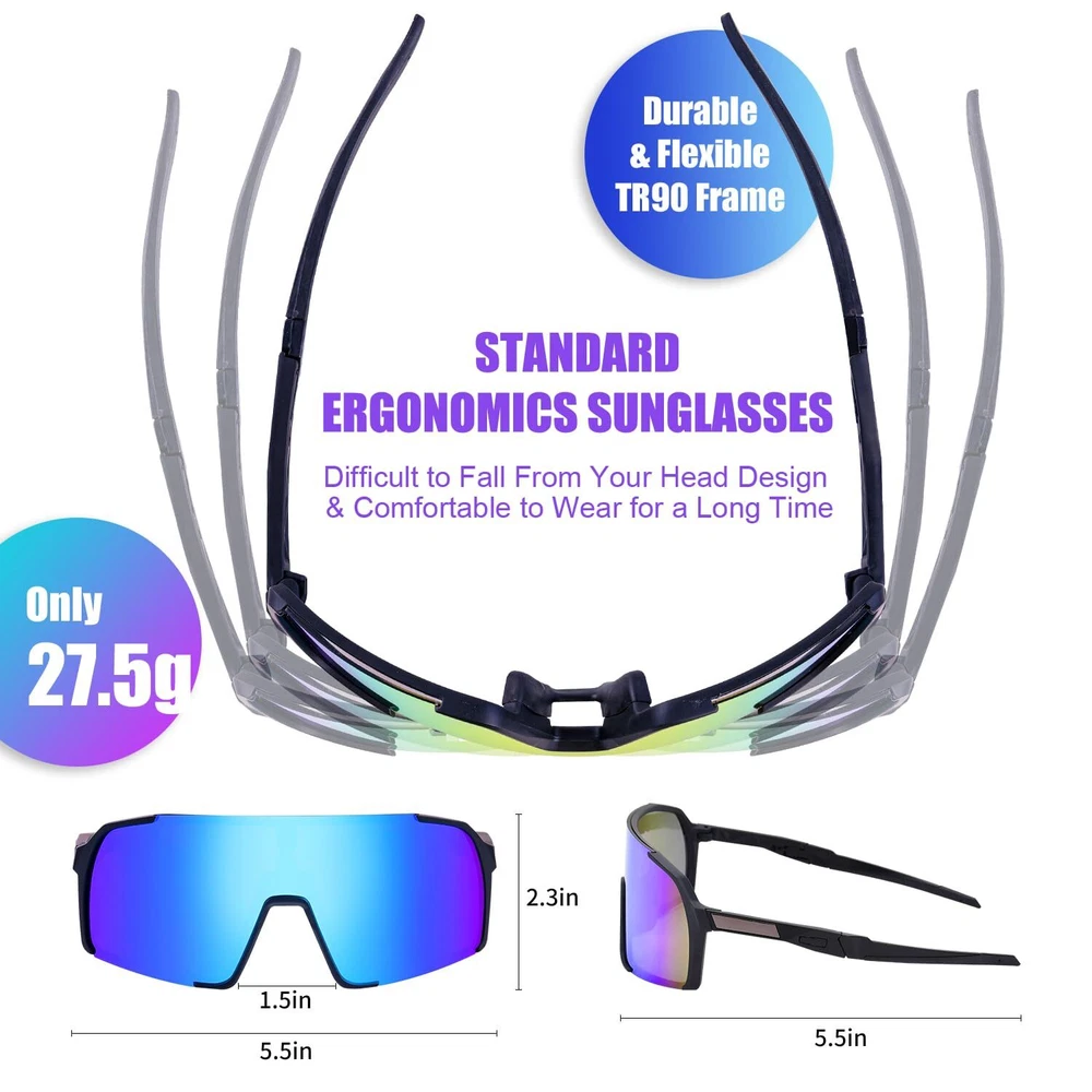 Description UV protection polarized sports sunglasses for men women youth kids; đ´âď¸ăShield Shaped Lenses for Different Face Shapesă This polarized sunglasses adopts a shield-shaped structure, with a technological design that can fit different face shapes and block a large area of strong light and UV rays for you.Its TAC lenses are made of high-quality materials, which are impact resistant, scratch resistant, durable, and not easily broken, effectively helping you block flying objects. đ´âď¸ăUV Protection HD Polarized Lensă This bike & baseball glasses uses high-definition TAC lenses.The polarization lenses can filter reflective light,especially the reflective light on the water surface,while blocking the glare caused by scattering,refraction and reflection.The high-quality UV coating can filter out 100% UVA, UVB, UVC rays and harmful blue light,blocking strong light.The HD lenses retain a high perspective rate,restore true colors and make your outdoor view more comfortable. đ´âď¸ăLightweight and Durable TR90 Frameă This sport sun glasses uses a high-strength and tough TR90 frame, with excellent compressive performance that allows you to face various challenges.It is equipped with high-quality anti-slip rubber legs and nose pads that can be installed with myopia frame, and has a comfortable ergonomic design that can fit snugly to your head without putting pressure on your nose. đ´âď¸ăVarious Protective Accessoriesă This blue lens sunglasses comes with a lens cloth for easy cleaning and wiping, an ultra-fine fiber material glasses bag to prevent scratches and can also be used as a cloth. Additionally, it is equipped with a polarization test card to verify performance and a durable eyeglass case for easy carrying. đ´âď¸ăVersatile Occasionsă This shield-shaped sunglasses have been commonly used in activities such as baseball, softball, cycling, fishing, golf and boating, and are also suitable for more outdoor sports such as motorcycles, running, skiing, volleyball, tennis, driving, Ironman triathlon, racing, mountain tourism, hiking, hunting, and golfing.