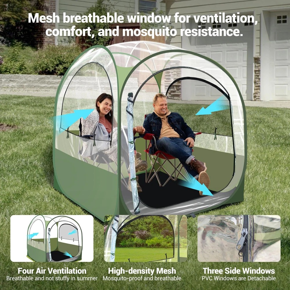 All Weather Sports Tent: Crafted with high-grade, water-resistant PVC and a PE floor, our sport tent ensures you stay dry and protected no matter the weather. The top rain cover and UV 50+ protection shield you from harsh sun rays and unexpected rain showers. Spacious Accommodation: Our weather 4 person pod tent measures 63"L x 63"W x 63"H, comfortably fitting 4-6 people, making it ideal for families or groups. Enjoy the game or the great outdoors together with ample room for everyone. Unparalleled 540-Degree View: Experience the ultimate viewing experience with our pop-up clear tent, designed with ultra-clear thick PVC for a full 540-degree panoramic view. Perfect for fans who don't want to miss a single moment of the action, whether it’s sports events, wildlife, or scenic landscapes. Effortless Setup in Seconds: Forget the hassle of complicated assembly! Our bubble tent features an advanced pop-up mechanism that allows for instant setup and easy takedown, letting you focus more on enjoying your outdoor activities. Mesh Ventilation and Privacy: There are 3 breathable vents with PVC and mesh on the two side windows to provide good ventilation in hot weather, both breathable and mosquito proof. Our unique sports pop-up tent design features three water-resistant opaque sides that enhance privacy while maintaining visibility. Ideal for families and groups who value both seclusion and the joy of watching their favorite events in comfort. Lightweight and Portable: Weighing just 17 pounds, our igloo tent dome includes a durable carrying bag for easy transportation and storage. Whether heading to a game, beach, or campsite, it’s perfectly portable for all your adventures. Versatile Outdoor Use: Beyond sports events, this tent is great for fishing, camping, and family picnics, providing a safe and comfortable outdoor haven. It’s also an ideal choice for photographers and nature observers who require a stable, clear view enclosure.