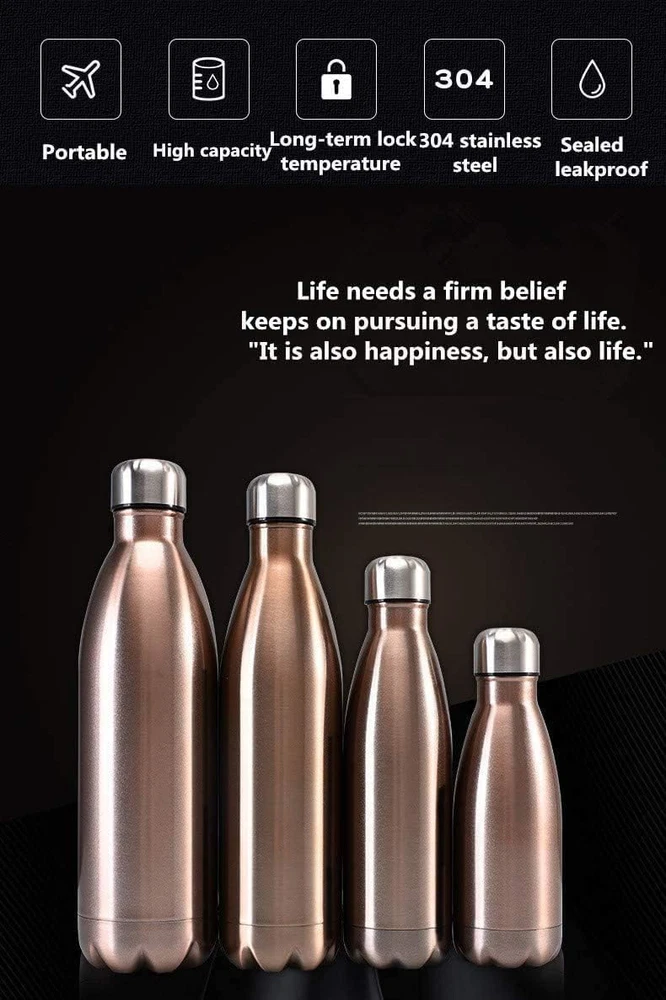 TOXIN FREE AND COMPLETELY SAFE - Worried about chemical contamination? Buy this sports water bottle for complete peace of mind. It's made entirely from completely hygienic, food-grade stainless steel. This means it's 100% BPA and phthalate-free - making it completely safe for all the family, including small children. TOUGH & LIGHTWEIGHT - Designed for life, these water bottles boast a premium quality, stainless steel build. It makes them much more durable than glass based vacuum flasks - and better able to handle a knock or drop when on the move. Lightweight, leak-proof and easy to carry, this water bottle is the ideal drinking companion for jogging, walking, cycling, triathlon, camping, fishing trips and more. Stay cool or keep warm :Unique double walled vacuum insulation technology with vacuum-seal cap keeps your drink cold for up to 24 hours or hot up to 12 hours.What a surprise! Enjoy all kinds of cool and fresh in summer, enjoy the warmth in cold winter. Suitable for cold water, Iced Coffee,hot drinks, hot coffee, hot chocolate,etc. Perfect for office workers,students,sports,outdoor enthusiasts, breast-feeding mothers, etc. Easy to carry and easy to clean : Perfect size for your gym bag, car, bicycle and backpack to enjoy your long hikes, sports, go to work, go to beach, school, office, picnic, hiking, camping, cycling,road trips, eat lunch out, on the road for soup, traveling, trip, driving, mountaineering, backpacking, hot yoga, gym, fitness. Order more than 50, you can customize the logo for free laser. For example: corporate anniversary promotion, holiday gift distribution, event souvenirs, meeting, etc.; according to customer requirements to make different styles, size, color and LOGO as corporate promotional items or gifts, cups can be printed logo, phone, address, two-dimensional Code, related product pictures, etc. ●Functions: ●1. Leak-proof,Rust proof and Durable Quality:High-quality food grade 18/304 stainless steel on both inside and outside walls. This will never rust or leave a bad metal taste in your mouth. 100% BPA Free for heath-safety. ●2. Unique Vacuum Insulation Technology: The double-walled vacuum insulated exterior will keep your drink cold for up to 24 hours or hot up to 12 hours. ●3. Keeps Your Drink Hot & Cold:Great for cold water, Iced Coffee, hot drinks, hot coffee, hot chocolate,etc. ●4. No Leaks:The exterior will never sweat. Don't worry about getting water on your desk, rings on your table, or a mess in your bag! ●5. Perfect Size & Easy to carry: The capacity is large enough to fit your daily hydration needs. Fashion cola style,easy and comfortable hold in hand and drink. And it is fit most cupholders.Put your portable sports water bottle in your gym bag, backpack or briefcase as your daily companion. ●6. Sweet and Love Gift:Both Men and Women are in fashion. Especially suitable for kids, older and adult. ●indulated water bottle will to be your friend.Enjoy all kinds of cool and fresh in summer,and enjoy the warmth in cold winter. ●Feature: ●Material: 304 stainless steel ●Capacity: 17 ounces (500ml) ●Mouth Diameter: 3.4cm/1.3 inch ●Bottle Dimension: 7 x 26.5 cm/2.7 x 10.4 inch ●Package included: ●1 x watter bottle