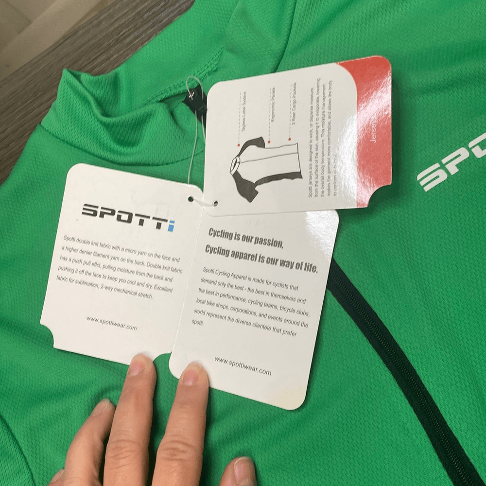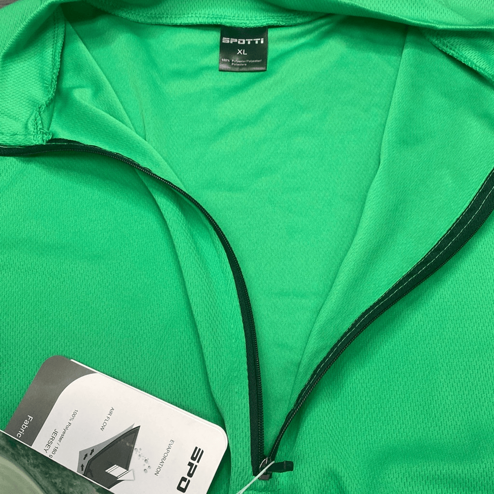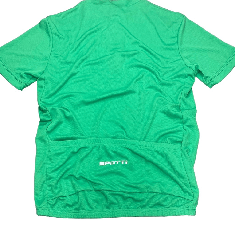 Spotti Cycling Jersey Men’s Green XL Moisture Wick With Cargo Pockets NWT New. Short Sleeve. Bright green. Cargo pockets in back. Half Zipper in front. Elastic at bottom. Approx flat lay measurements: Pit to pit 21” Length 27.5”