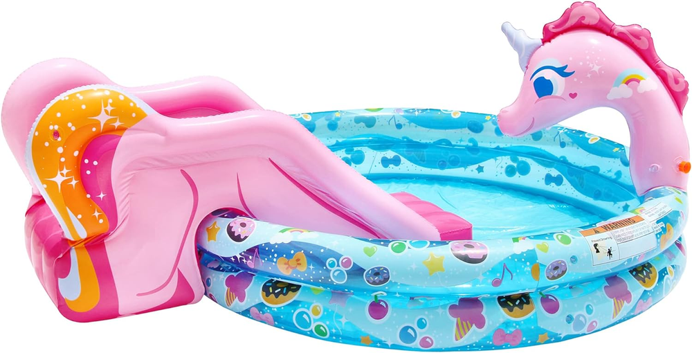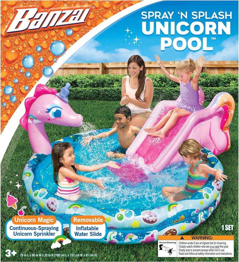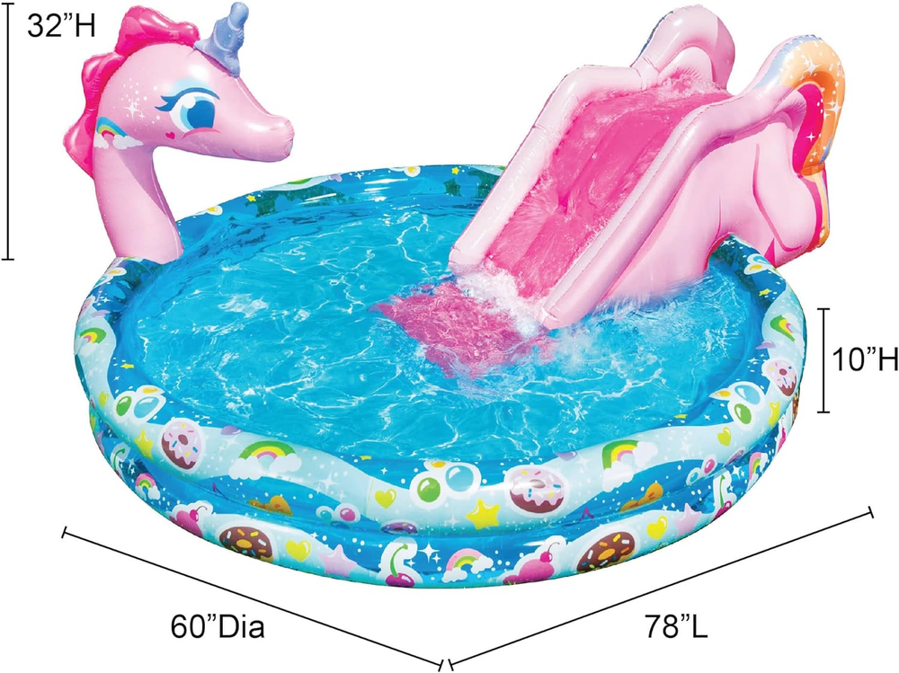 Spray 'N Splash Unicorn Pool, Length: 78 in, Width: 60 in, Height: 32 in, Inflatable Outdoor Backyard Water Slide Splash Toy Product size:: 78"L x 60"W x 32.5"H The unicorn Contents include: 1 inflatable pool, 1 inflatable slide, 1 repair patch and 1 water watcher tag. Slide down the unicorn. Durable PVC construction. There's a Unicorn in your backyard! Go down the slide and splash into the sweetness of summer with the spray N' Splash unicorn pool! Little ones will love to splash and play with the magical unicorn and its water filled 5 ft diameter pool. Item model number 13648FR Item Weight 6.49 pounds Product Dimensions 78"L x 60"W x 32"H Assembly Required No Color Multicolor Special Feature Inflatable, Portable, Built-In Sprayer, Lightweight, Foldable, Drain Hole Material Polyvinyl Chloride (PVC) Country of Origin China Global Trade Identification Number 00191124136482 Shape Round Manufacturer recommended age 3 years and up Frame Material Polyvinyl Chloride (PVC) Age Range (Description) Kid Included Components inflatable pool Target Audience Unisex-Kids Release date March 1, 2019 60.0 "h x 78.0 "h x 32.0 "h. Weight: 6.49 lb Shipping from the USA All of our products are shipped from the USA, ensuring quick delivery to your destination. Payment We offer the following payment methods: PayPal, credit card, bank transfer, and eBay's secure payment system. Free Shipping & Free Returns Shipping within the USA is FREE. Additionally, any return is absolutely free for you. Risk-Free Purchase You have the option to return an item within 30 days without any justification. We cover the return shipping costs! Fast Shipping We ship immediately upon receipt of payment. Generally, the package is delivered within 2-3 days in the USA. If it takes longer, we will contact you. Quality and Costs Made in Europe, USA, China No customs fees or additional charges Total satisfaction guarantee Invoice with declared VAT available upon request in .pdf format Feedback Your feedback is very important to us. After you pay for your purchase, you will automatically receive positive feedback from us.