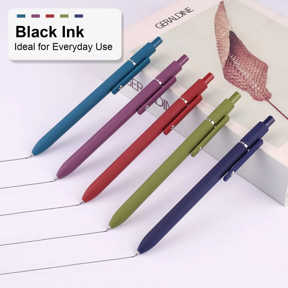 SMOOTH WRITING: The tip of the gel ink pen consists of a 0.5 mm roller ball for smooth writing. These quick-drying black ink pens adopt reliable ink that won't fade or smudge easily, keeping pages clean and tidy.(Please lay the pen flat or click close after use to extend the service life of the pen tip) RETRACTABLE DESIGN: 5 Pack of ballpoint pens in different colors are specially designed for fashion conscious. Easy to use, click to open/close. The satisfying click response makes it a great way to relieve stress and be inspired. HIGH-QUALITY MATERIALS : This gel pen is easy to hold. With the super soft and comfortable grip, you will not feel tired after writing for a long time, and will love the fine point and the soft touch feel. PRACTICAL PEN CLIP: The Pen clip with little steel ball design can be firmly clipped to books, notebooks or pockets. Easy to carry and prevent loss. Also, the little steel ball on the clip are fun to spin. PERFECT GIFT: These retractable gel ink pens great for home school office supplies, enough quantity to meet your daily use.The prefect gift for family/ friends/ coworkers/ holidays. Please feel free to contact us if you have any issues with the product.