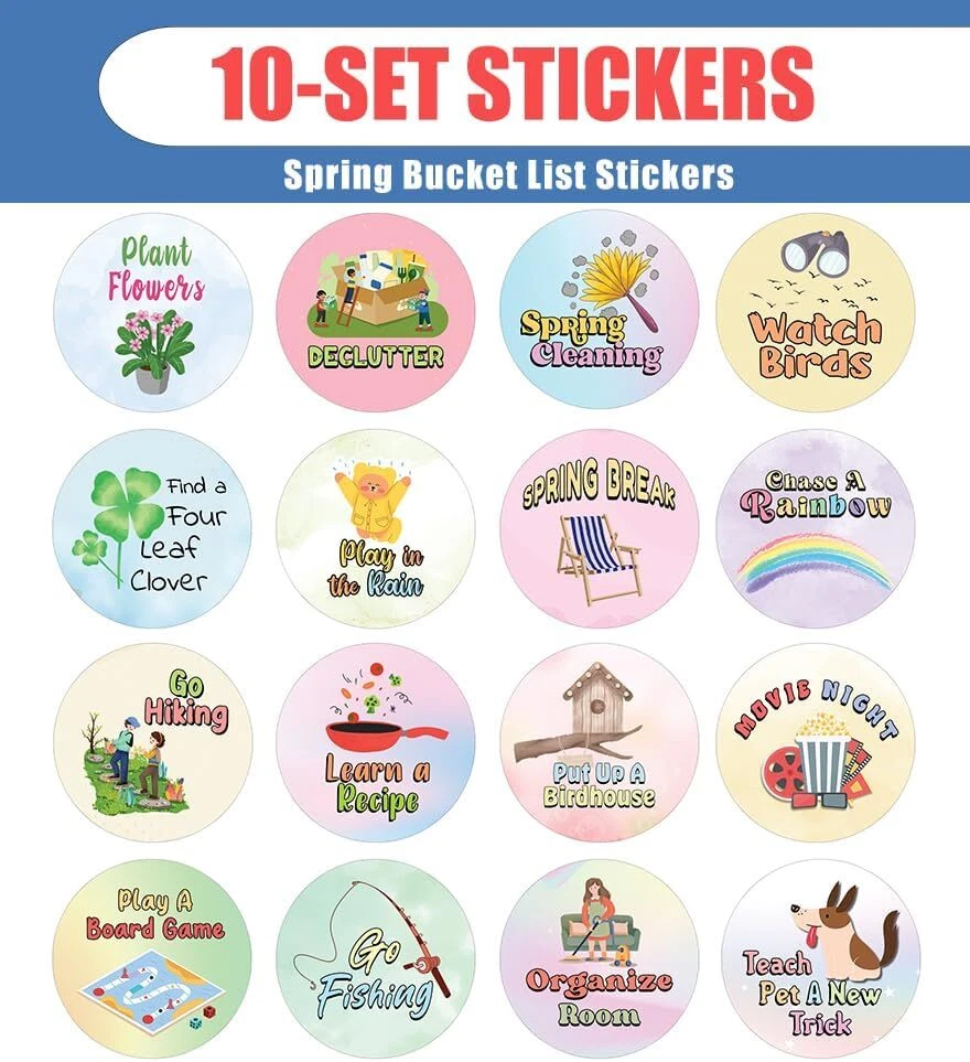 16 UNIQUE DESIGNS INSPIRING STICKERS FOR YOUR DIY PERSONALIZED DECORATIONS - Creanoso Spring Bucket List Stickers (10-Sheets). These colorful and uniquely inspiring round shaped stickers are the best tool for DIY decoration and personalization of your belongings. GREAT STOCKING STUFFERS , TEACHING SUPPLEMENTARY MATERIALS, AND GIVEAWAY - Great stocking stuffers gifts for Boys, Girls, Teens, Kids. A perfect design to give during classroom school activities, home schooling,birthdays, anniversaries, family day, and any other special occasions. MADE WITH DURABLE AND WATERPROOF MATERIALS - There is a lamination or coating to make the stickers high water resistant, and WILL NOT not fade from the water. The stickers can stick it anywhere you like, and it sticks there and lasts a long time. A COLORFUL AND DECOR STICKER DECAL - Each sheet with 16 individual round stickers. There are 10 sheets , with a total of 160 pcs of stickers. STICKER SIZE: 1.5 INCHES IN DIAMETER Spring Bucket List Stickers (10 Sets X 16 Designs) COLORFUL AND COLLECTION OF TEXT STICKERS • Well designed. • Very encouraging. • Self-adhesive. Spring Bucket List Stickers (10 Sets X 16 Designs) are super fun to collect; you can't have just one! That's why you will find a selection of stickers right here. Each package comes with different stickers in a variety of designs. Stick them here, stick them there, stick them everywhere! Everyone will love these self-adhesive stickers. These colorful stickers are perfect for any adults and these come with very inspiring messages and bright pictures. A fun, inexpensive way to add a decorative, notes, and stationery. Delight yourself with uplifting messages designs that are very encouraging. Spring Bucket List Stickers (10 Sets X 16 Designs) perfect for giveaways, behavior incentives, prizes! These stickers are acid-free, nontoxic, and safe for use on photos. This product comes with a 60 days money back guarantee. You can return them to us for a full refund.