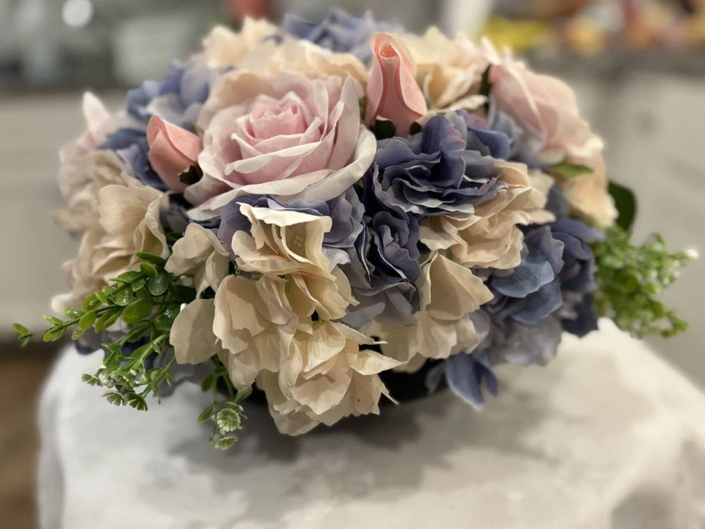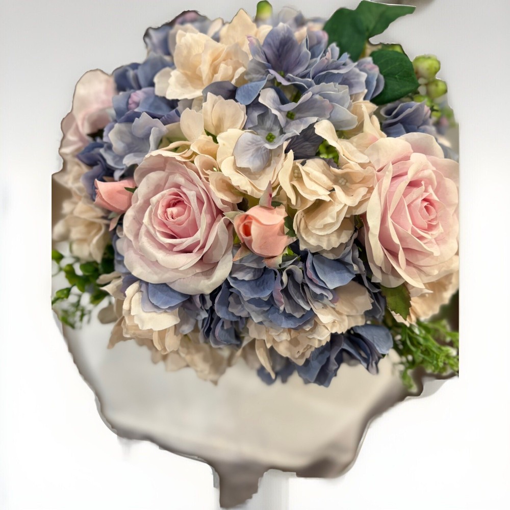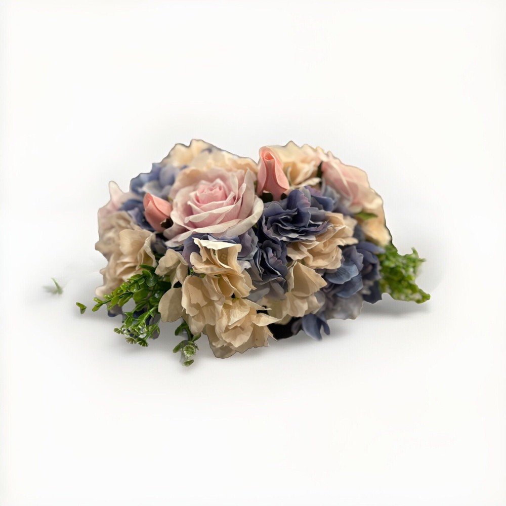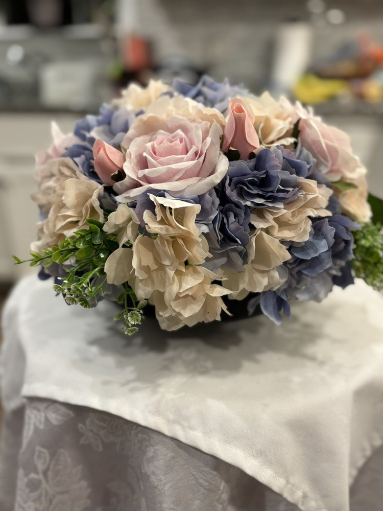 This is a preowned floral arrangement centerpiece designed for the spring season. The arrangement features a mixture of artificial roses in a multicolor palette, set in a 14-inch glass planter. The flowers are made of high-quality artificial silk, handcrafted into a beautiful 16-inch centerpiece. Additionally, the arrangement includes built-in LED lights powered by batteries to add a charming touch to any home décor. This faux floral arrangement is perfect for adding a touch of elegance and springtime charm to any room. Container is black glass, barely visible to allow flowers to pop. Returns accepted 30 days; buyer pays return shipping