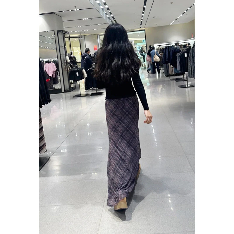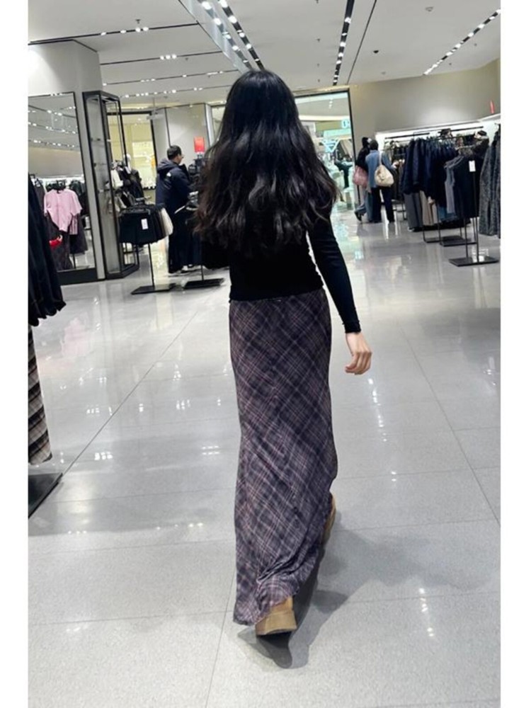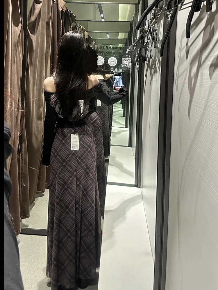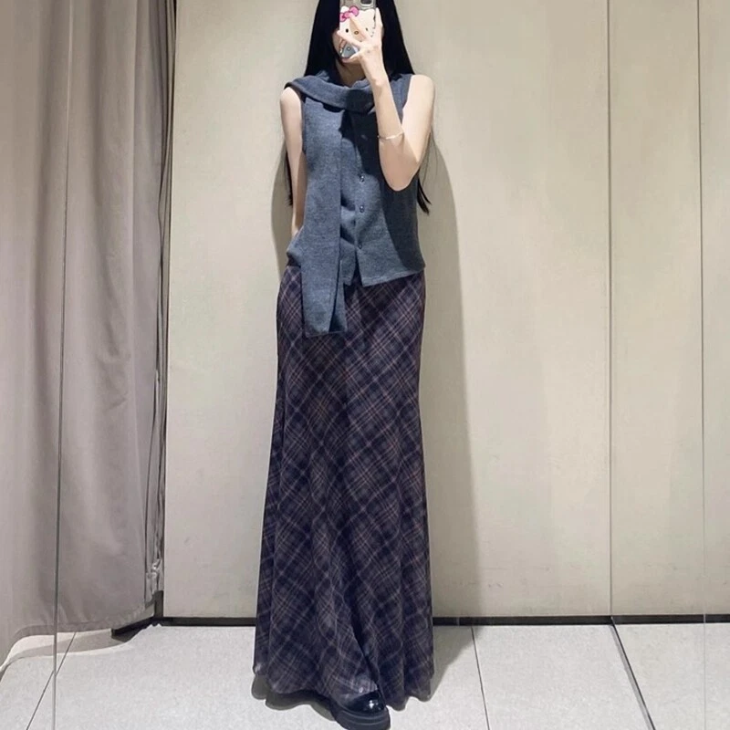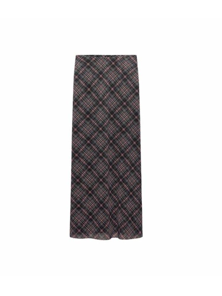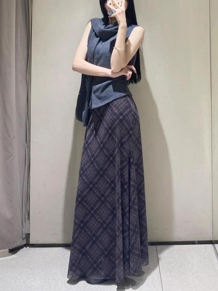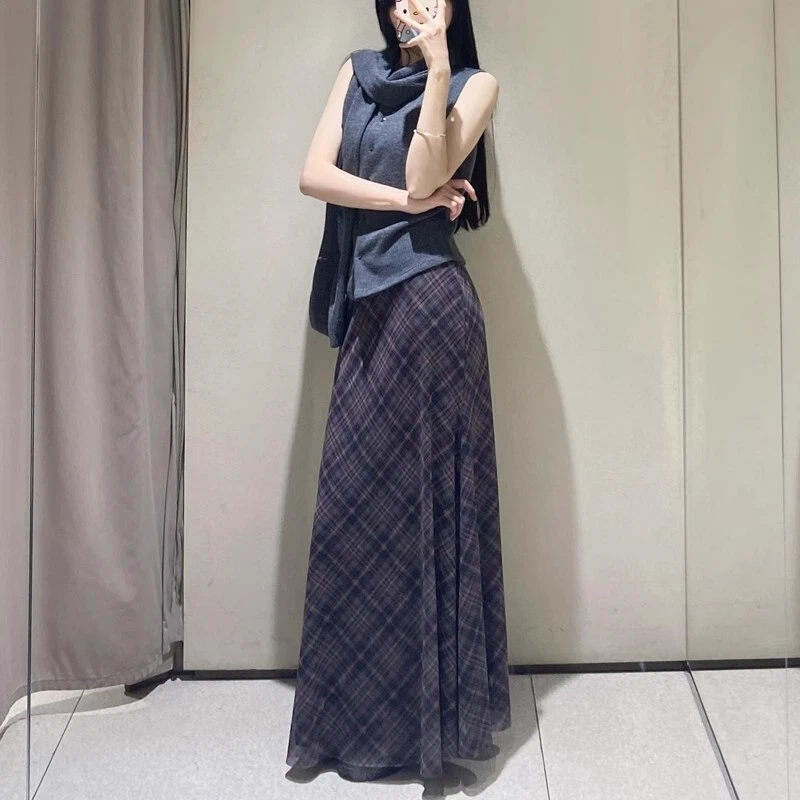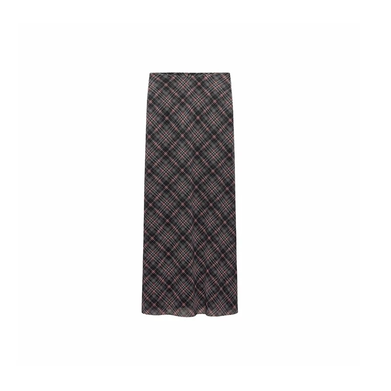 Spring Summer High Waist Splicing Hem Plaid Silk Mesh Long Skirt Women