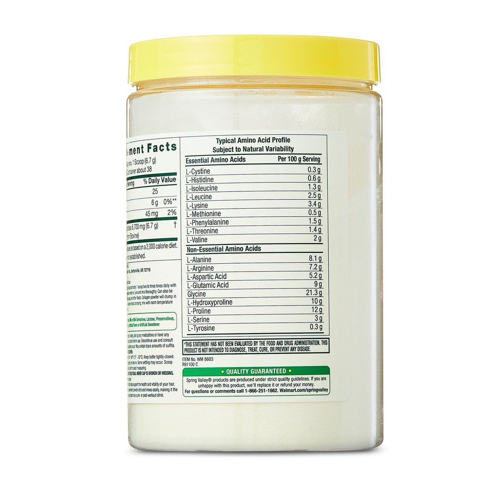 Spring Valley Collagen Peptides Type 1 and 3 Dietary Supplement is your go-to solution for healthy hair, skin, nails, and joints.* This powerful powder stirs and mixes seamlessly into six to eight ounces of water or your favorite juice for easy consumption, and its collagen-packed formula provides the building blocks to help support your health and vitality. Take this unflavored powder with you for an on-the-go boost or a pre- or post-workout drink. You can even opt to whirl it into your favorite smoothie for a special treat. Supplement your healthy lifestyle with the Spring Valley Collagen Peptides Type 1 and 3 Dietary Supplement.* Spring Valley understands living a healthy, balanced lifestyle is the key to being your best self. With an affordable range of products inspired by , Spring Valley supports your and your family's health and holistic wellbeing. Spring Valley Collagen Peptides Type 1 & 3 Dietary Supplement, 9 oz Go-to solution for healthy hair, skin, nails, and joints* No gluten, yeast, wheat, milk, lactose, sugar, soy, or preservatives No artificial color or flavor Stirs and mixes easily 9 oz tub contains about 38 servings Keto and paleo formula *These statements have not been evaluated by the Food and Drug Administration. This product is not intended to diagnose, treat, cure, or prevent any disease