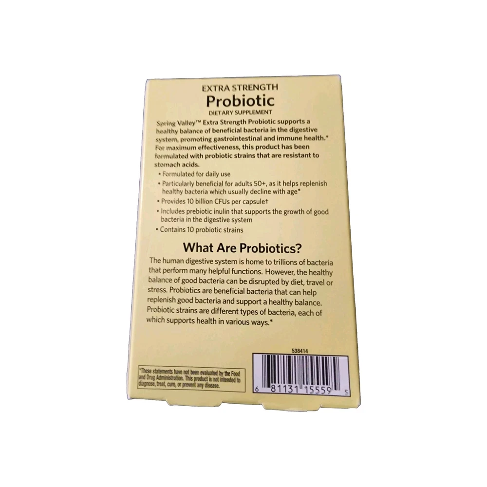 Say goodbye to poor digestive health with Spring Valley Extra Strength Probiotic Vegetable Capsules. Stress, travel, aging, and bad diets can disrupt your body's digestive system balance. These probiotic capsules help support a healthy balance of beneficial bacteria in the digestive system, promoting gastrointestinal and immune health.* This product has been formulated with probiotic strains that are resistant to stomach acids for maximum effectiveness. This value size package includes 60 vegetable capsules with 10 billion CFUs per capsule. With 10 different probiotic strains per capsule, you'll be on the path to fantastic digestive health with just one capsule per day. Keep your body in tip-top shape with Spring Valley Extra Strength Probiotic Vegetable Capsules. Spring Valley understands that living a healthy, balanced lifestyle is the key to being your best self. With an affordable range of products inspired by nature, Spring Valley supports your and your family's health and holistic well-being. ****THIS PRODUCT PACKAGE/BOX MAY HAVE SOME IMPERFECTIONS**