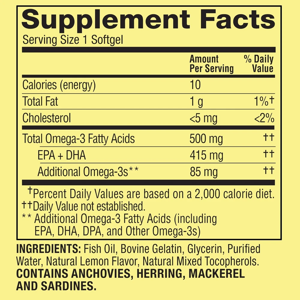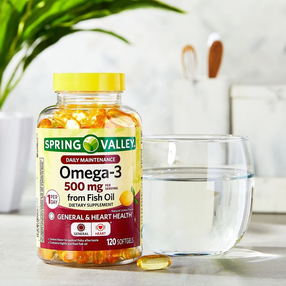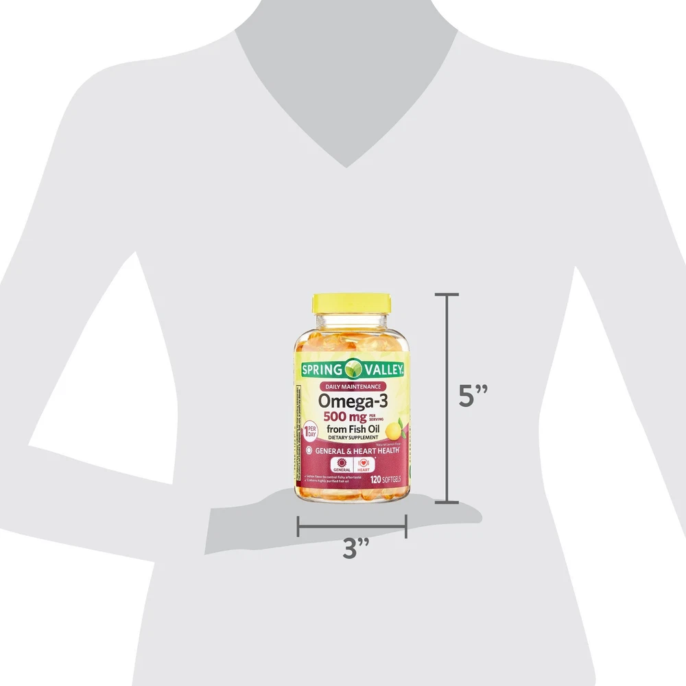 Spring Valley Fish Oil Omega-3 General Supplement Softgels, 500 mg, 120 Count Fish Oil Omega-3 General & Heart Health Dietary Supplement Softgels, 500 mg, 120 Count General and heart health support dietary supplement* Daily maintenance Omega-3 from highly purified fish oil May reduce the risk of coronary heart disease* Contains 500mg of omega-3 fatty acids per softgel 1 per day Natural lemon flavor controls fishy aftertaste No gluten, yeast, wheat, milk or milk derivatives, lactose, sugar, or crustacean shellfish No artificial flavors or colors 60 count per tamper-evident bottle *These statements have not been evaluated by the Food and Drug Administration. This product is not intended to diagnose, treat, cure, or prevent any disease Discover more fantastic items by visiting our eBay store! Thank you for choosing to shop with us. We appreciate your support!