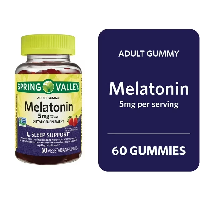 Product details Spring Valley Melatonin Pectin Dietary Supplement Gummies, Strawberry, Spring Valley Pectin-Based Melatonin Gummies are the simplest, best-tasting way to take Melatonin. Our delicious and easy to chew gummies make taking Melatonin a joy. Non-GMO Spring Valley Vegetarian Melatonin Gummies contain 5 mg of Melatonin per serving. Melatonin helps regulate sleep and wake cycles and may support more restful sleep in circumstances of altered sleep schedules such as jet lag or shift work. Take control of your sleep with Spring Valley Pectin-Based Melatonin Gummies. Spring Valley Melatonin Pectin Dietary Supplement Gummies, Strawberry, 5 mg, 60 Count Spring Valley Melatonin Adult Pectin-Based Gummies, 5 mg, 60 count 5 mg of Melatonin per serving Helps regulate sleep and wake cycles May support more restful sleep in circumstances of altered sleep schedules Delicious Easy to take