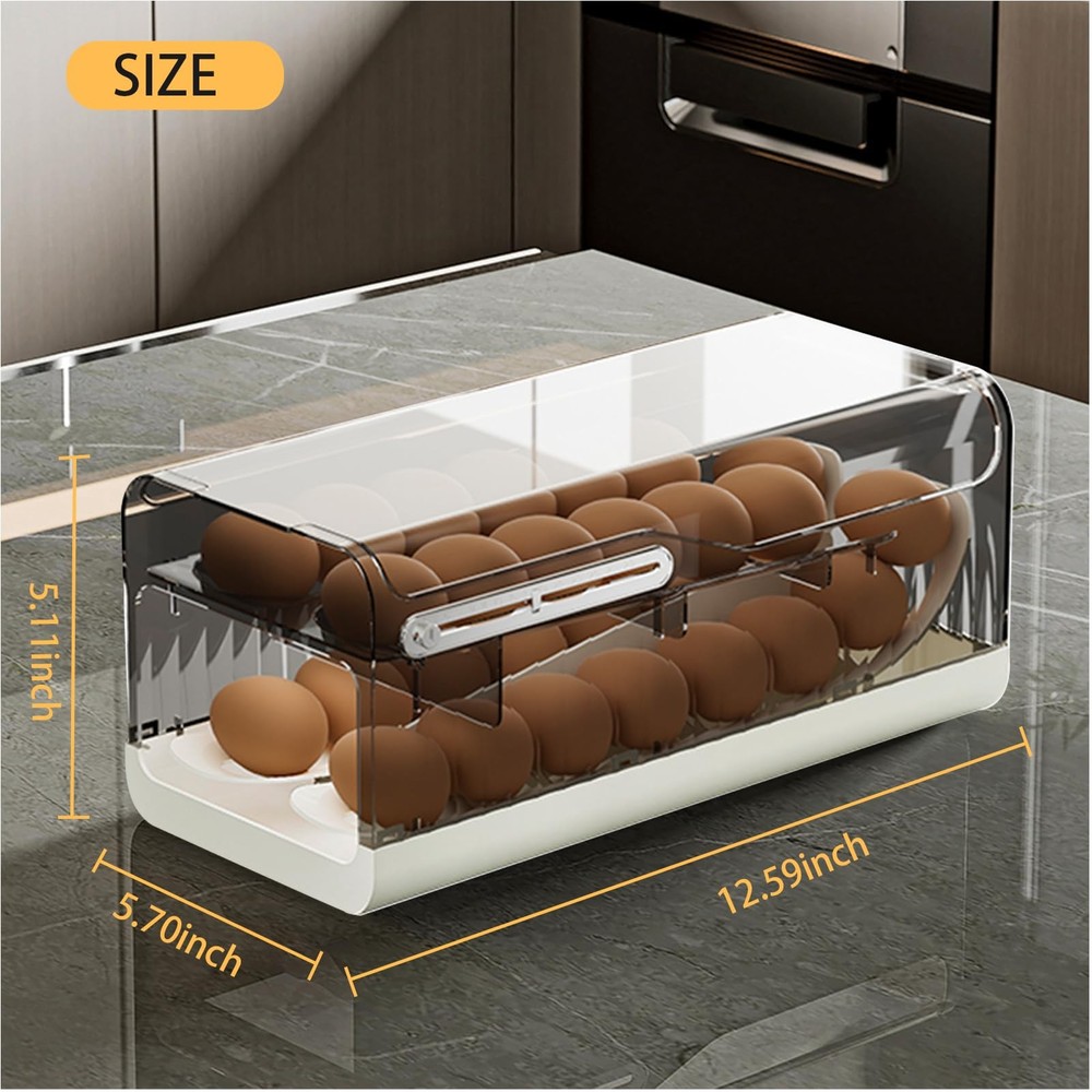 Product Specification: Material: Eco-friendly PP+PS material Eco-friendly PP+PS material Layers: 2 layer egg tray Capacity: up to 28 eggs Design Compact two-tier construction Features Transparent visual push and roll design with dustproof and timekeeping function, automatic rolling gravity feed tray, non-slip base. Product Highlights HIGH QUALITY MATERIAL: Our egg organizer is made of eco-friendly PP+PS material, durable and guaranteed to last you a long time in the kitchen. The use of high quality materials ensures that the eggs are safe and secure. TRANSPARENT VISIBILITY: Our egg carton is designed with a transparent dust cover to keep out flying dust and allow you to observe the eggs in time for replenishment. PUSH AND ROLL EGGS FOR EASY REMOVAL: The ramp design allows for automatic egg replenishment and the elastic springs allow for easy rolling for convenient egg pickup, press and roll for easy egg pickup, no more searching for eggs in the fridge. Our Gravity Egg Tray features an automatic rolling system that gently moves eggs along a sloped track for easy access without opening lids or pulling drawers. You can effortlessly pick your eggs while the others are moving around, ensuring seamless access and convenience every time. FRESHNESS TIME: We understand the importance of freshness, which is why our egg trays are equipped with a removable date recorder. Now you can easily adjust the date setting and never have to worry about using expired eggs again. No more guessing or risking sniffing! HASSLE-FREE MAINTENANCE: Our egg trays come with a sturdy, non-slip base and are ready for immediate use with no assembly required. Simply drop in your eggs and let the automatic rolling system keep them organized. Cleaning is a breeze, ensuring hygiene and convenience in your daily kitchen routine. 【EASY TO USE AND SPACE SAVING 】The egg dispenser for refrigerator has two resilient spring at the base. When pressed the plastic row, the eggs will automatically roll forward, and you can easily take out the eggs without opening the lid. The double-row and double-layer egg tray is designed with a slope, and the eggs will automatically move forward to fill up. At the same time, when you do not press the spring, the eggs can stay stable in the egg basket optimize your refrigerator space with our egg rack. Holding up to 28 eggs, its sleek design not only saves space, but also keeps eggs neatly organized and easily accessible, improving the overall efficiency of your kitchen. 【ADJUSTABLE DATE RECORDER】Our egg storage container has a time scale function on the side, and comes with a 31-day shelf life scale. You can set the date for storing eggs so that you and your family can eat fresh eggs every day We understand the importance of freshness, which is why our egg tray comes with a detachable date recorder. Now you can easily adjust the month and day settings so you never have to worry about using expired eggs again. No more guessing or risky sniffing tests. 【TRANSPARENT VISIBILITY, PUSHING AND ROLLING EGGS FOR CONVENIENT USE】Our egg carton is designed with a transparent dust-proof cover to block the entry of flying dust and allow you to observe and replenish the eggs in time, a sloping design for automatic egg replenishment, flexible springs for easy rolling of eggs for convenient use, and a press test for rolling eggs to say goodbye to the hassle of searching for eggs in the refrigerator. Enjoy the convenience. 【QUALITY MATERIAL AUTOMATIC EGG REPLENISHMCNT】 Our egg organizer is made of environmentally friendly PP+PS material, durable and guaranteed to last you a long time in the kitchen. The use of high quality materials ensures that the eggs are safe and reliable. Our egg trays feature an automatic rolling system that gently moves the eggs along an inclined track for easy access without opening the lid or pulling the drawer. Eggs move forward automatically, ensuring seamless access every time. 【HASSLE-FREE MAINTENANCE AND HIGH EFFICEIENCY】 Our egg tray comes with a sturdy, non-slip base and is ready to use right out of the box with no assembly required. Simply drop in your eggs and let the automatic rolling system keep them organized. Cleaning is a breeze. This egg carton will brighten up your refrigerator, pantry and beyond. Its streamlined design not only stores eggs safely, but also ensures freshness and easy access, making it an indispensable kitchen accessory.always focus on product quality and value the shopping experience of our customers. Whenever you have a question, please feel free to contact