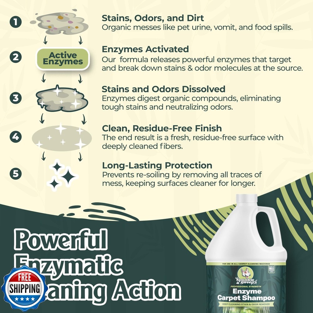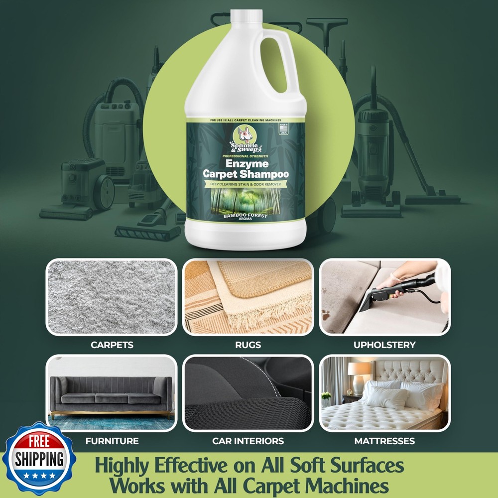 Sprinkle and Sweep Enzyme Carpet Shampoo - Carpet Cleaner Solution to Eliminate Tough Stains and Neutralize Odors at the Source - Car, Furniture, Carpets and Rug Cleaner - Use with All Machines (1 Gallon) Features POWERFUL ENZYMATIC CLEANING: This carpet cleaning solution for machines uses advanced enzymes to break down tough stains and odors at a molecular level, making it a reliable carpet cleaner for pets accidents, food spills, and more RESIDUE-FREE FORMULA: Our low-foaming carpet shampooer solution leaves no sticky residue behind, keeping carpets cleaner for longer; this carpets stain remover and odor neutralizer prevents future stains and re-soiling SAFE & FAMILY-FRIENDLY: Carefully formulated to be safe for use in homes with children and pets, our rug cleaners for carpet are also a practical pet carpet cleaner, ensuring effective cleaning even for tough pet accidents, while being gentle on your home and the environment OPTIMIZED FOR CARPET EXTRACTORS: Specifically designed for rug shampooers for carpet, carpet extractors, and wet/dry vacuums, this enzyme carpet cleaner shampoo works deeply and efficiently to remove contaminants from carpet fibers VERSATILE & LONG-LASTING: Effective on carpets, rugs, upholstery, furniture, and car interiors, this concentrated carpet cleaner shampoo delivers powerful cleaning with exceptional value in every bottle Shipping Free & Fast Shipping: We offer free shipping to most of the USA with a normal delivery time of 3-7 days. However, due to the current situation, additional delivery time (up to 3 weeks) may be required for some items. Alternative Carriers: We may use alternative carriers (e.g., USPS, FedEx, UPS) to ensure your package arrives safely and on time. Due to the use of multiple carriers, we are unable to provide a tracking number automatically. Handling Time: Orders are processed and shipped within 1-2 business days of receiving cleared payment. Shipping Restrictions: Shipping to Alaska, Hawaii, Puerto Rico, Guam, and other US territories may incur shipping charges or delivery restrictions. Please contact us before ordering, or your order can be refunded/cancelled. State Restrictions: Certain items may not be shipped to California due to state regulations. Contact for Tracking Updates: If you require tracking updates or have any concerns about the delivery of your order, please feel free to contact us, and we will be happy to assist you. Return Policy 30-Day Hassle-Free Returns: If you are not completely satisfied with your purchase, you can return the item for free within 30 days of receiving it for a full refund or exchange. Easy Return Process: Contact us, and we will provide you with a prepaid return shipping label and detailed instructions. No Restocking Fee: There are no restocking fees for returns. However, the buyer is responsible for return shipping costs if the return is not due to a seller"s error. Refund Processing: Refunds will be processed within 1 business day of receiving the returned item in its original condition. Feedback Your feedback is extremely important to us. We strive to provide the best products and customer service possible. If you are satisfied with your purchase, please take a moment to leave us a positive review. If you have any concerns or issues with your order, please contact us before leaving negative feedback. We are committed to resolving any problems and ensuring your satisfaction. Contact Us If you have any questions or concerns, please feel free to reach out to our customer support team. You can contact us through the eBay messaging system. We are available Monday to Friday, 9:00 am to 5:00 pm EST, and we will do our best to respond to your inquiry within 24 hours. Thank you for supporting our small family business!
