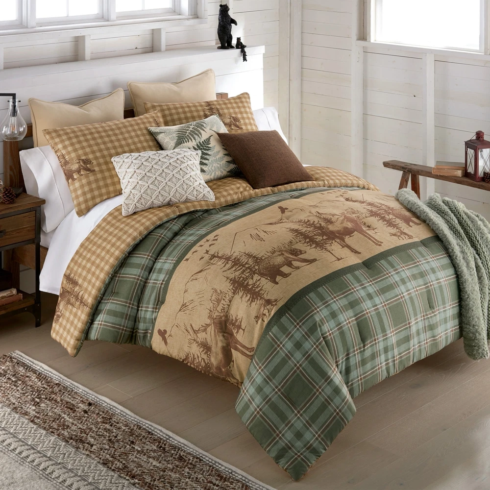 Introducing the Spruce Trail Lodge Comforter Set from Your Lifestyle by Donna Sharp: Experience Rustic Comfort in Your Bedroom! Transform your bedroom into a serene wilderness retreat with our Spruce Trail Lodge Comforter Set. This captivating ensemble showcases a stunning sketched mountain scene, adorned with charming wildlife motifs such as moose, bear and pine trees. Immerse yourself in nature's beauty as you curl up in the warmth of this cozy bedding set. Crafted with meticulous attention to detail, our Spruce Trail features a large, peaceful plaid border that surrounds the captivating mountain design. Shades of sage green, cocoa, and tan add a touch of earthy elegance to your space, infusing it with a rustic charm that is sure to impress. The comforter's flip-side offers a delightful Free Shipping Over $49.99* Details Spruce Trail 3 PC Comforter Set from Your Lifestyle by Donna Sharp Product Description: Introducing the Spruce Trail Lodge Comforter Set from Your Lifestyle by Donna SharpExperience Rustic Comfort in Your Bedroom! Transform your bedroom into a serene wilderness retreat with our Spruce Trail Lodge Comforter Set. This captivating ensemble showcases a stunning sketched mountain scene, adorned with charming wildlife motifs such as moose, bear and pine trees. Immerse yourself in nature's beauty as you curl up in the warmth of this cozy bedding set. Crafted with meticulous attention to detail, our Spruce Trail features a large, peaceful plaid border that surrounds the captivating mountain design. Shades of sage green, cocoa, and tan add a touch of earthy elegance to your space, infusing it with a rustic charm that is sure to impress. The comforter's flip-side offers a delightful surprise with a gingham check pattern, further enhancing the lodge-inspired aesthetic. Sketched bear and pine tree motifs on the reverse side create a harmonious balance, showcasing the perfect blend of nature and classic style. Each set includes 1 comforter and 2 pillow cases. (Image on pillow cases may vary slightly) 100% Microfiber, machine washable. Features: 100% Microfiber Reversible to a new design Machine wash cold, tumble dry low Queen set includes 1 comforter 90" x 90" and 2 standard pillow cases 20" x 26" King set includes 1 comforter 104" x 96" and 2 king pillow cases 20' x 36"
