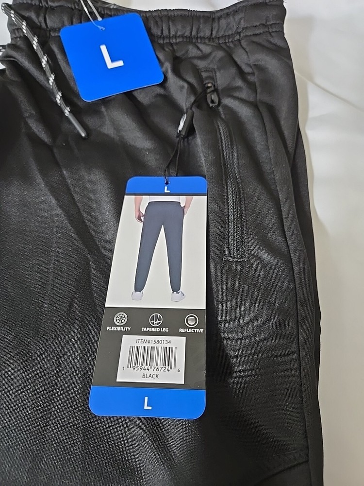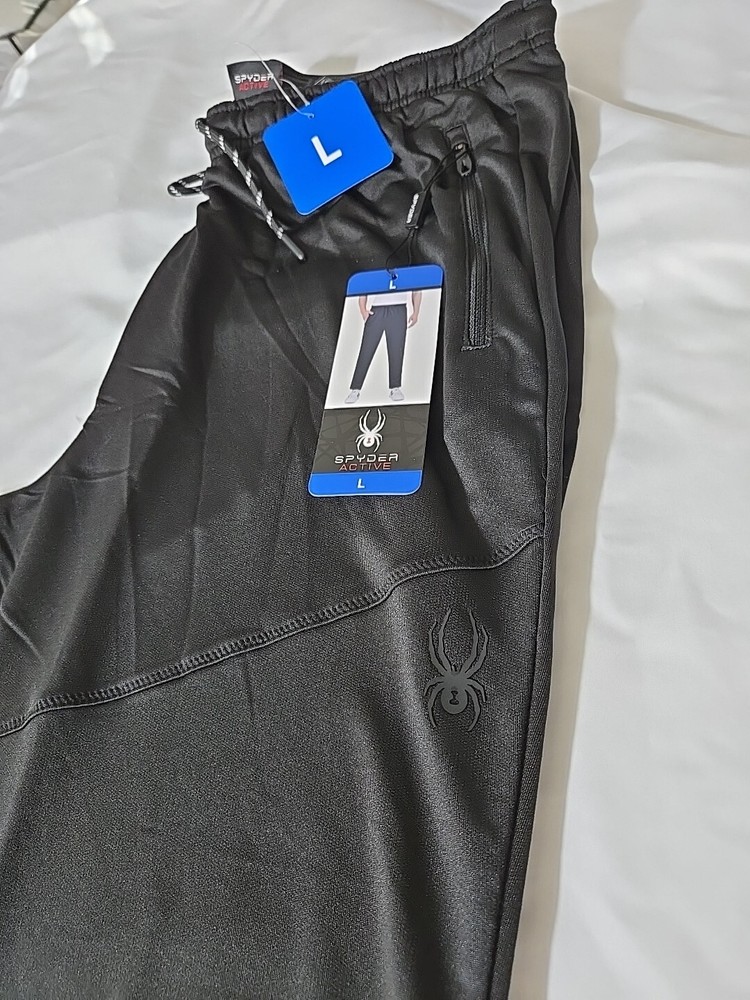 Department: Men Color: Black Type: Pants Brand: Spyder UPC: Does not apply Product Line: Spyder Style: Jogger Occasion: Activewear Size: L Fabric Type: 96% polyester 4% spandex Fit: Regular gtin13: Does not apply Size Type: Regular Features: Reflextive tapered leg flexability Performance/Activity: Running & Jogging, Gym & Training, Cross Training, Hiking