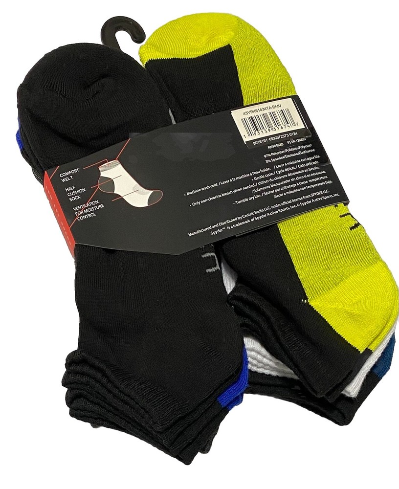 Spyder 6-Pairs Men's Low Cut Socks Assorted Half Cushion 97% Polyester 3% Spandex Sock Size: 10-13 fits Shoe Size: 6-12 New In Package