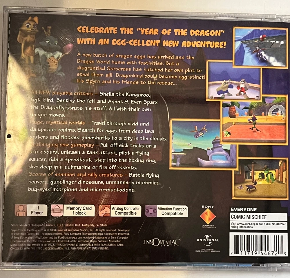 Immerse yourself in the magical world of Spyro 3-Year of the Dragon on Sony PlayStation 1. This game promises to transport you to a mystical land filled with adventure and danger. With a rating of E-Everyone, it is suitable for players of all ages.Explore the vast open world, customize your character, and team up with other players to take on challenging quests. This game comes with a 3-year manufacturer warranty, ensuring that you have a hassle-free experience. Get ready to embark on an epic journey like no other with Spyro 3-Year of the Dragon on Sony PlayStation 1.