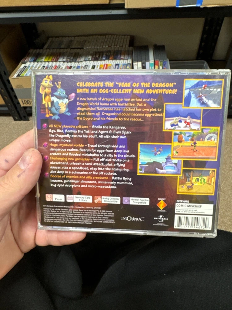 UPC:0711719446729Region Code:NTSC-U/C (US/Canada)Platform:Sony PlayStation 1MPN:SCUS-94467Release Year:2000Game Name:Spyro: Year of the Dragongtin13:0711719446729Genre:Action & AdventureRating:E-EveryoneManufacturer Warranty:1 YearFeatures:Manual IncludedVideo Game Series:SpyroPublisher:SCEA