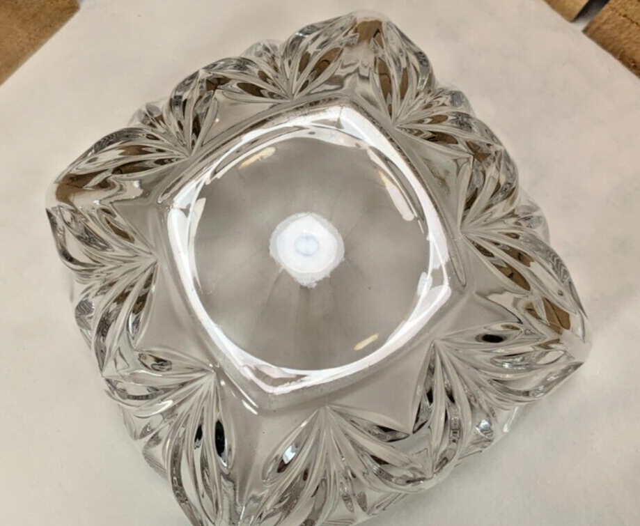 Beautiful Square Crystal Candy, Nut or Snack Dish or Bowl. Approximately 5 3/4"L x 5 3/4"W x 3 3/4"H and weighs 2 lbs 7 oz. This item does not appear to have any cracks or chips. It does have normal wear on the bottom. Please see all photos as they are part of the description. We try to list as many details as possible, however some items are vintage and pre-owned so flaws are to be expected. We try to find out as much information as possible on each item we have available. On occasion we may make a mistake and appreciate your feedback.
