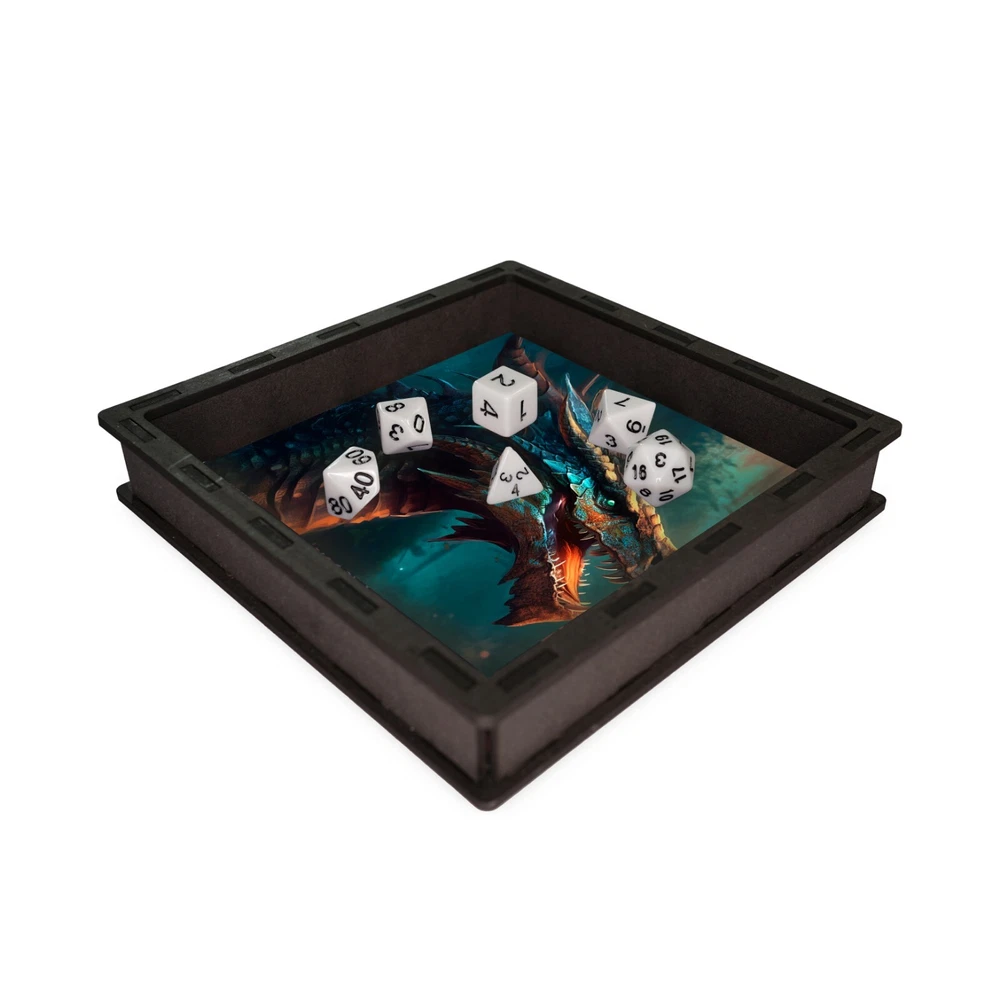 Wooden Dice Tray Inlay on printed neoprene Tray for rolling dice / tabletop games External Size - 17cm x 17cm x 3cm; Internal Size - 15cm x 15cm x 2.5cm Dice NOT included Made and hand finished from laser cut black MDF with printed neoprene inlay for a statement tray with an even rolling surface. Prevents lost dice, crawling around on the floor for that elusive D20, chasing the dog for a die they've picked up, arguing over a strategically placed corner die wedged in the carpet etc. I offer safe and secure worldwide shipping, and can combine shipping at only 50p per additional item (highest base rate applies). If you like what you see please check out my other listings, follow me on Pinterest, or favourite my shop for updates on new items! Please note all my items are made to order in the UK and dispatched within the stated time frame. Not quite what you're looking for? Please check out my other items here- https://www.ebay.co.uk/sch/finch_rock_123/m.html