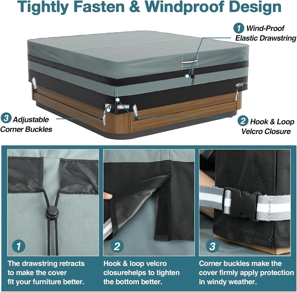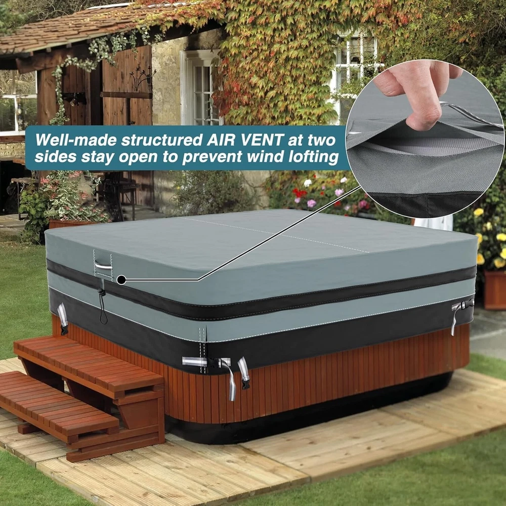 About this item 【 High-quility Durable Material 】- The GREENER hot tub cover is made of heavy duty 600D Oxford fabric with thick PVC coating on the back. The spa cover is waterproof and durable, providing protection against rain, snow, sun and dust, which make sure it can be used outdoor or indoor in different seasons. 【 100% Waterproof & UV Protection】 - Our jacuzzi cover is made of premium waterproof fabric. At the same time, the stitching place is upgraded with waterproof tape seam to ensure that the cover is 100% waterproof. 【 Windproof For All Seasons】 - Heavy duty elastic cords secures the cover for a snug fit over the tub, hook and loop fasteners and Velcro at the bottom allow adjustment for a tight custom fit. Portable handles on both sides designed to quickly place and remove. 【 Breathable Design 】- There are two hidden AIR VENTS on two sides of the spa cover for hot tub to ensure air circulation. Effectively prevents moisture accumulation and wind lofting. 【 Universal Size】 - GREENER hot tub/spa cover provide perfect protection to your outdoor hot tub. Cover size:87"(W)*87"(L)*20"(H).General suitable for square hot tubs with a side length not greater than 87 inches. 【 Customer After-sales Service 】- We are committed to providing you with quality products and providing you with impeccable customer