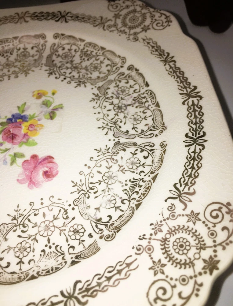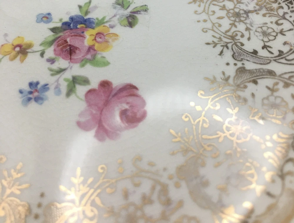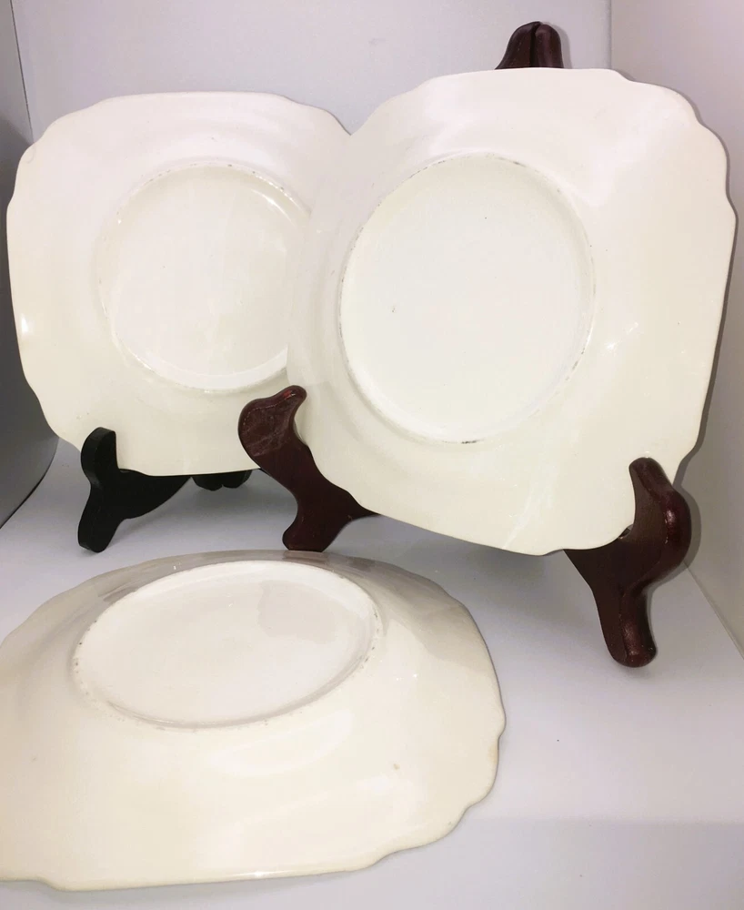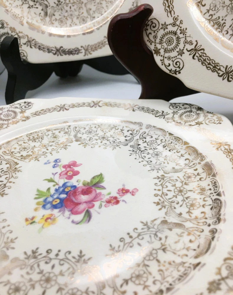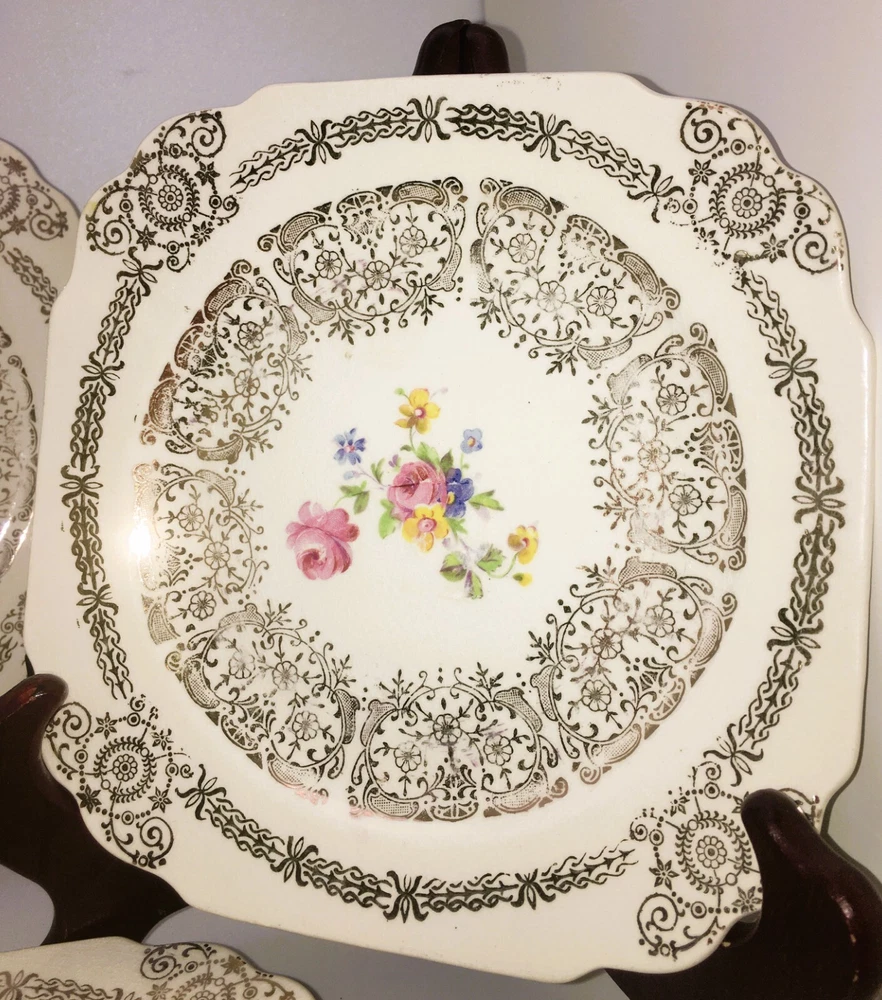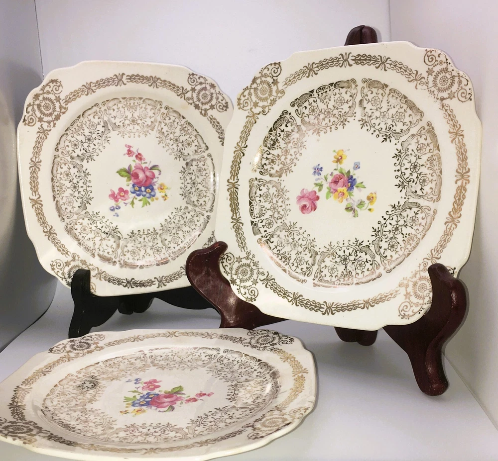 Vintage Set of 3 Square Salad Plates 22K Gold Ornate Details with roses and scrolls ~ Lovely filigree pattern that catches the light (see photos) Pink & multicolored floral bouquet in the center of each plate with cabbage roses Measure 6 1/2" diameter Unmarked ~ pattern name unknown although reminiscent in style of Limoges, Sebring, American Limoges in the 1930s...could be any of those but I'm not certain as they are not marked No chips or cracks. Minor crazing. Please see photos and zoom if for clarity. This is a beautiful set for display or replacement! Carefully packed and shipped by Daisy!