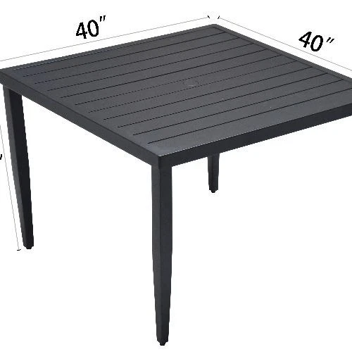 Safe and stylish rounded corners .Ember black powder coated. Non-slip nylon adjustable feet pad protect floor. Ember Black Main Material: Aluminum Product Style: Contemporary Outdoor Seating Type: Complete Patio Sets Use Case: Garden & Outdoor Frame Durability: Rust Resistant Frame Assembled Length (in.): 40.00 Assembled Width (in.): 40.00 Assembled Height (in.): 28.74 Weight (lbs.): 30.20