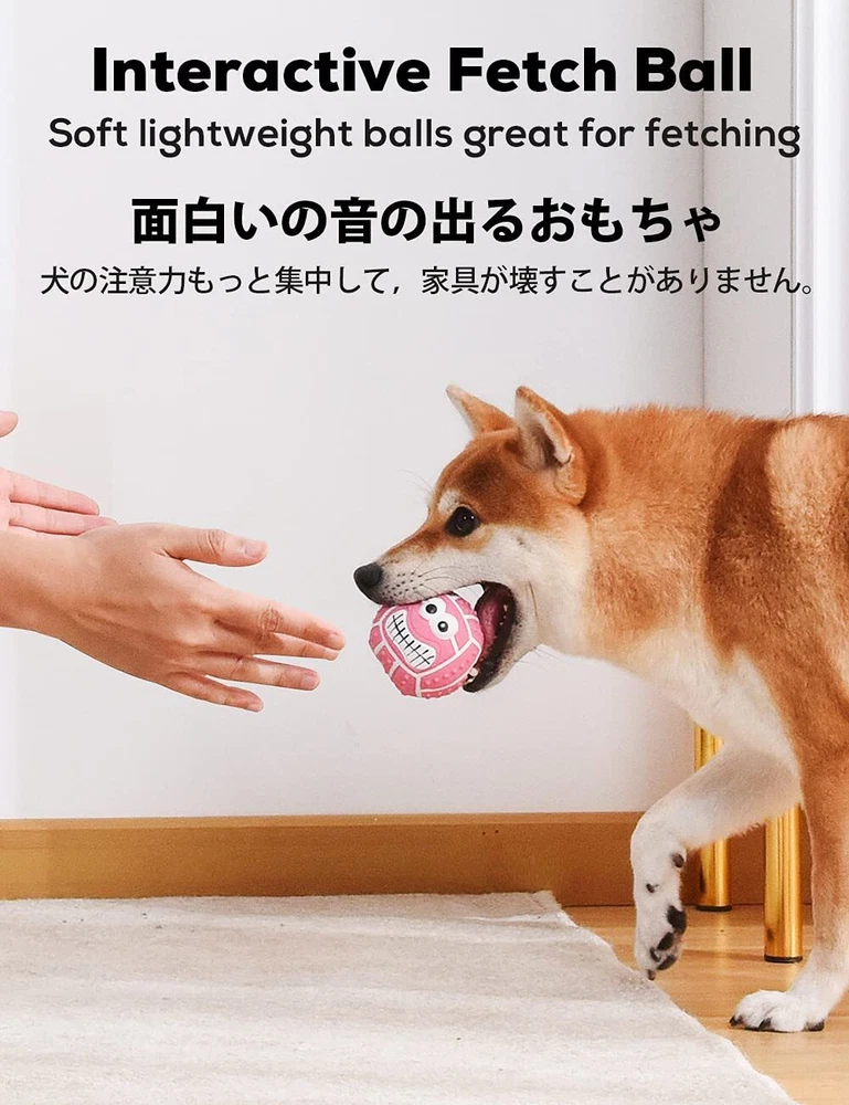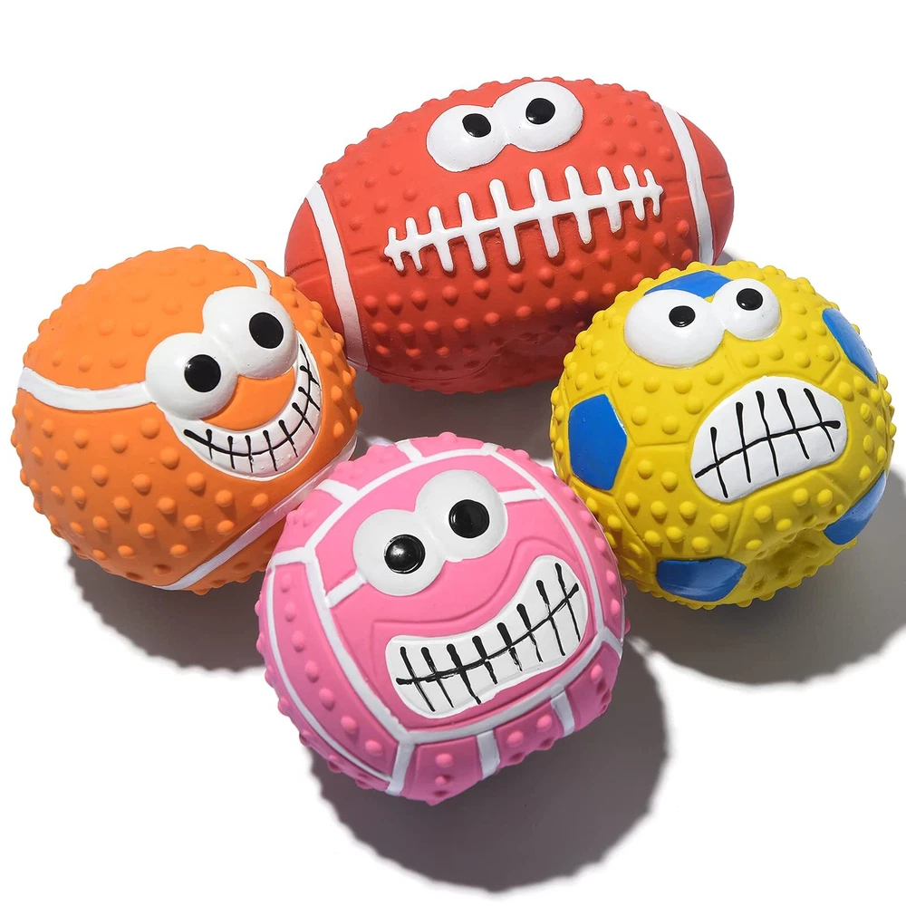 Funny Squeaky Toy: The internal squeaker in each toy emits an engaging squeaking sound when dogs bite, which grabs dogs' attention, makes them excited and keeps them busy. Bouncy Fetch Balls: The soft and bouncing pet balls bounce and roll when thrown to the ground, doggies will jump and run to chase the ball, great for indoor and outdoor chasing, fetching and training. Safe Latex Rubber Toy: The toys are made of non-natural latex, which is flexible and safe for pups to chew and play. The latex doggy toys are easy to clean, simply rinse with water. Teeth Cleaning Bumps: The textured bumps added to the surface of the squeaky balls help clean teeth, massage the gums and promote dental during teething. Dog Toy Set for Medium Small Pets: Includes different sports balls with lovely smiley faces, like basketball, football and volleyball, which are about 2.7” in diameter (size of a standard tennis ball), perfect for medium small dogs.