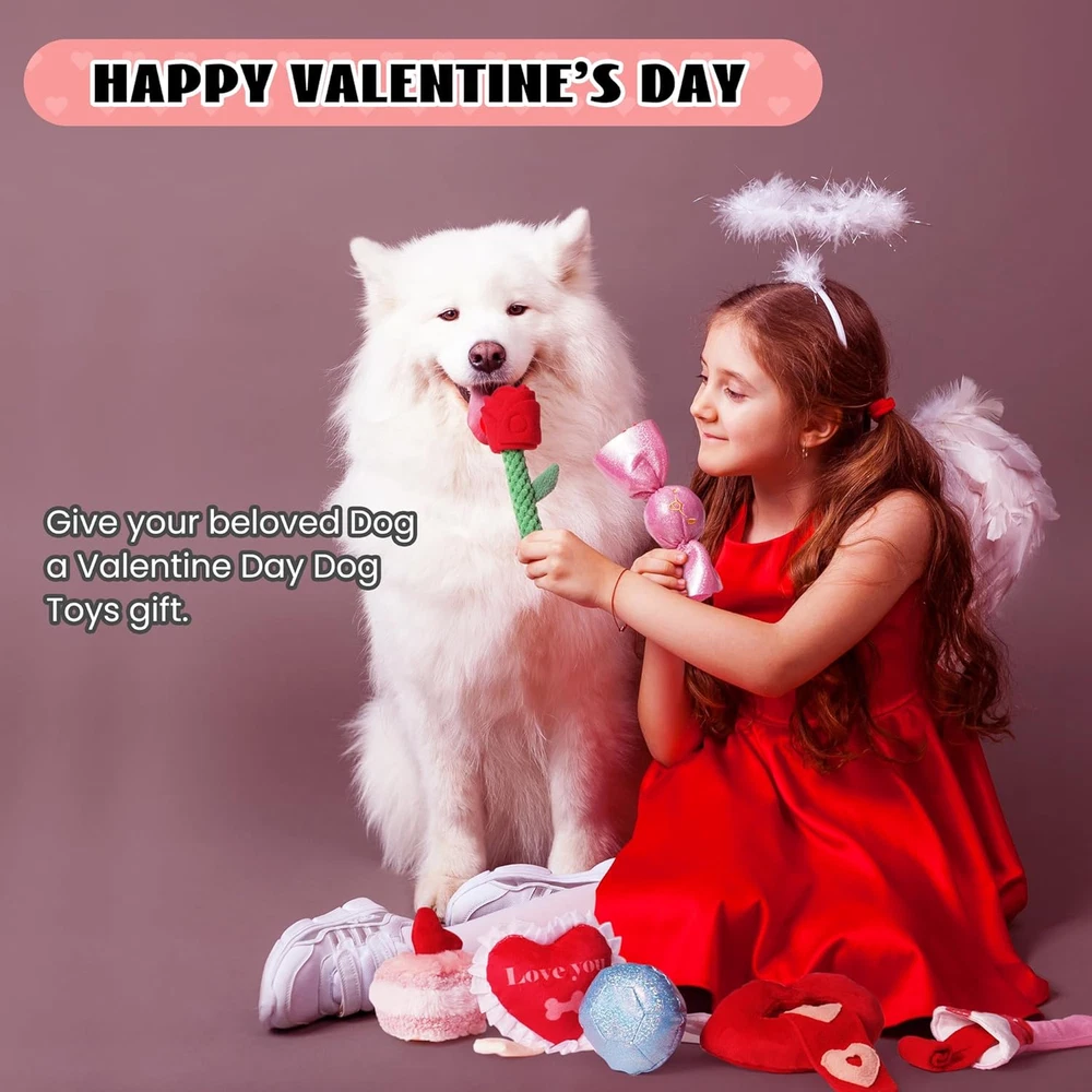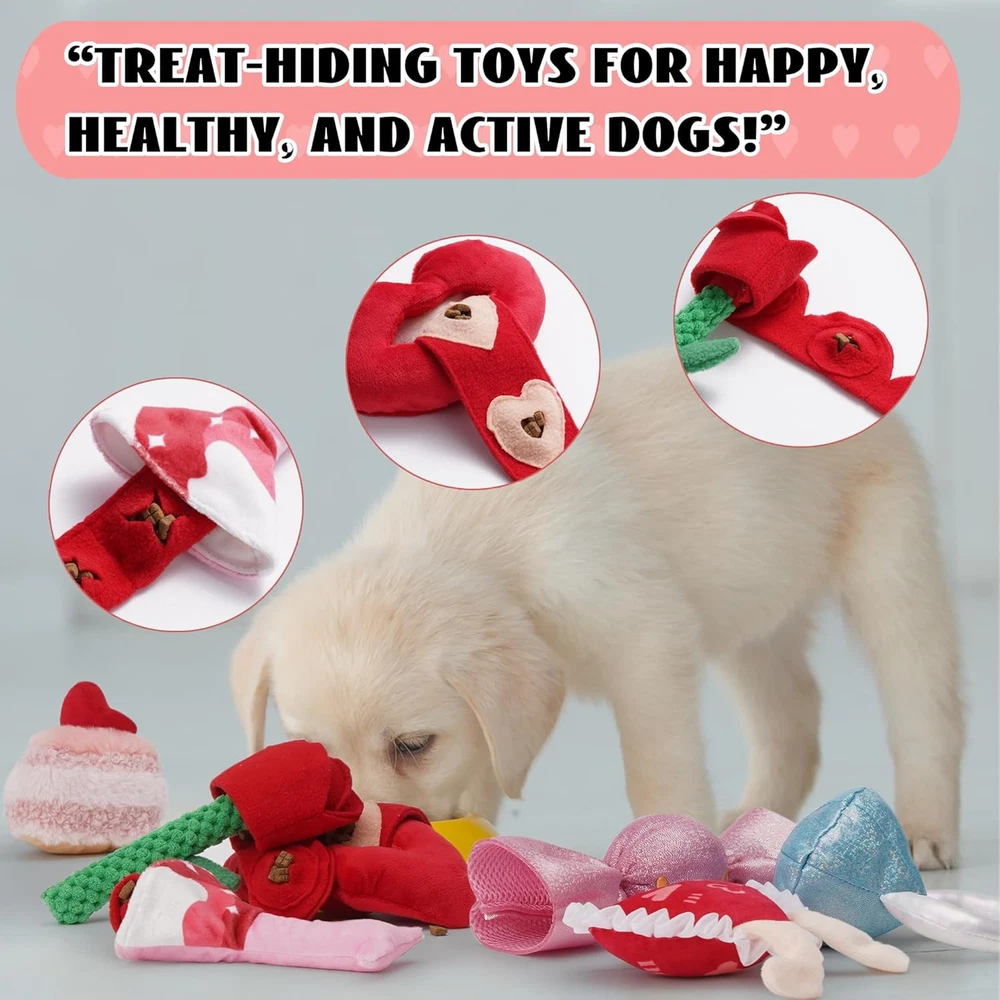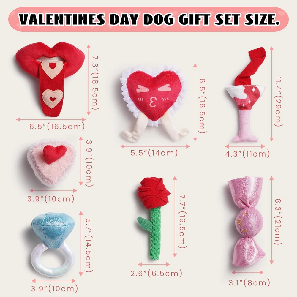 Dog Toys Valentines Day Themed Design: This set includes 7cute dog toys, each designed in a playful and romantic style with shapes like hearts, roses, a wine glass, a diamond ring, lips, cakes ,and candy. These valentines plush dog toy not only enhance the fun for dogs but also create a strong Valentine's Day atmosphere Interactive Dog Toys with Multiple Elements: Each fun dog toy for small dogs provides sound stimulation, enhancing interactivity, playfulness, and entertainment during playtime.Some of them have embroidered designs or printed text, some of them can hide treat, some of them have crinle papers or squeakers Durable and Safe Materials: This Valentine's Day dog stuffed toy set is made from pet-safe, non-toxic materials, while being durable and bite-resistant, able to withstand dogs' daily play and dog chew toys Suitable for All Dog Sizes: Whether for small, dog toys for medium dogs, or large dogs, the dog toy multipack in this set cater to the needs of different breeds, bringing fun and entertainment to every dog with these entertaining dog toys A special Valentine Day dog gift: As a special Valentine's Day dog enrichment toys, it not only brings joy to your pet but also strengthens the bond between you and your furry companion, making it the perfect way to express your love Product Description 7 PCS Valentine Day Squeaky Dog Toys The perfect Valentine Day gift Is this doy suitable for large dogs? This toy set is indeed suitable for large dogs. The toy sizes in this set range from 3.9 inches to 11.4 inches, catering to the needs of dogs of different sizes. How safe is the filler material? The filler material used in the interactive dog toy set is made from safe, non-toxic materials that are harmless to dogs. However, it's still advised to closely monitor your dog's behavior while playing for preventing accidental How to clean the toys? To extend the life of the toys, hand wash and air dry them. Avoid using hot water, bleach, or a dryer, as these might damage the toy's material and structure. Are the toys safe for dogs' teeth and gums? Yes, the plush toys in this set are gentle on dogs' teeth and gums. The texture of the cotton fabric offers a certain friction, helping to clean dogs' teeth during play. How is the bite resistance of the toys? These toys are made from high-quality materials and feature exquisite embroidery craftsmanship and upgraded strong stitching, providing good bite resistance. However, they might not be the best choice for dogs with strong biting power. Nocciola Squeaky Dog Toys to Keep Them Busy Add to Cart Add to Cart Add to Cart Add to Cart Add to Cart Add to Cart Add to Cart Customer Reviews 4.7 out of 5 stars 9 4.4 out of 5 stars 98 4.4 out of 5 stars 566 4.5 out of 5 stars 690 4.5 out of 5 stars 690 4.7 out of 5 stars 160 4.5 out of 5 stars 14,014 Price $16.99 $ 16 . 99 $19.99 $ 19 . 99 $24.95 $ 24 . 95 $24.95 $ 24 . 95 $22.95 $ 22 . 95 $16.95 $ 16 . 95 $19.99 $ 19 . 99 Count 7 packs 9 packs 5 packs 9 packs 9 packs 8 packs 12 packs Breed Small, Medium, Large Dogs Small, Medium, Large Dogs Small, Medium, Large Dogs Small, Medium, Large Dogs Small, Medium, Large Dogs Medium, Small Dogs Puppy, Medium, Small Dogs Stuffed ✔ ✔ ✔ ✔ ✔ ✔ ✔ Squeaky ✔ ✔ ✔ ✔ ✔ ✔ ✔ Machine washable ✔ ✔ ✔ ✔ ✔ ✔ ✔