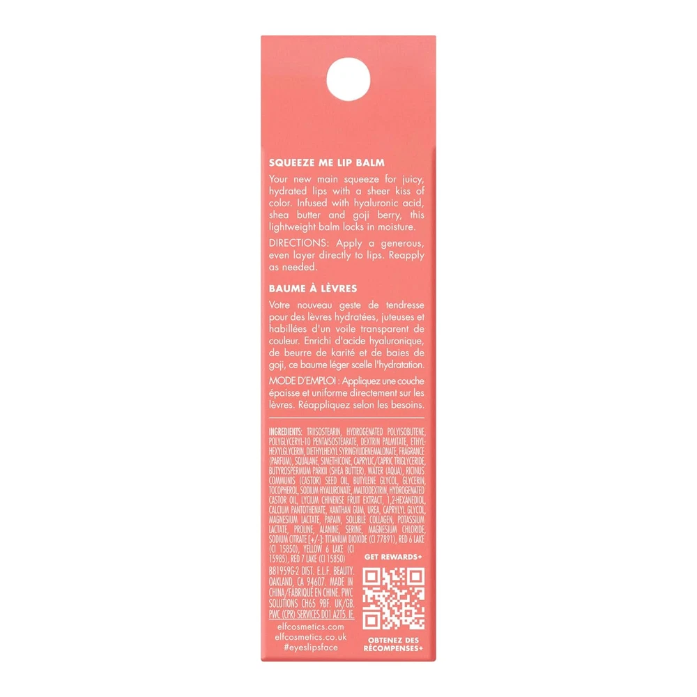 MOISTURIZING LIP BALM: Meet e.l.f. Cosmetics Squeeze Me Lip Balm, your new favorite lip product for hydrated and nourished lips. DELIVERS SHEER COLOR: This moisturizing leave-on lip balm helps hydrate with a sheer tint of color. INFUSED WITH HYALURONIC ACID: This lip balm is boosted with lip-loving ingredients like shea butter, hyaluronic acid, and goji berry. GREAT FOR TRAVEL: Easy-to-use squeeze tube and applicator for when you’re on the go. SKIN-LOVING INGREDIENTS: All e.l.f. products are made from skin-loving ingredients you want, minus the toxins you don’t—all at good-for-you prices. All e.l.f. products are 100% cruelty-free and Vegan. Meet e.l.f. Cosmetics Squeeze Me Lip Balm, your new favorite lip product for hydrated and nourished lips. This moisturizing leave-on lip balm helps hydrate with a sheer tint of color and is enriched with lip-loving ingredients like hyaluronic acid, shea butter, and goji berry. Perfect for getting a boost of moisture with a sheer tint of color wherever you are. Why You’ll Love It: Lightweight, leave-on formula helps hydrate and nourish lips Sheer tint of color Easy-to-use squeeze tube and applicator for when you’re on the go Boosted with lip-loving ingredients like shea butter, hyaluronic acid, and goji berry Available in multiple delicious scents and shades Key Ingredients: Shea butter Hyaluronic acid Goji berry Great For: Normal, Dry, Oily, and Combination Skin Types Ingredients may change or vary from time to time. Please refer to the packaging of the product received for the list of ingredients in your particular product. All e.l.f. products are proud to be 100% vegan, cruelty-free, and Leaping Bunny Certified. Because kindness is chic.