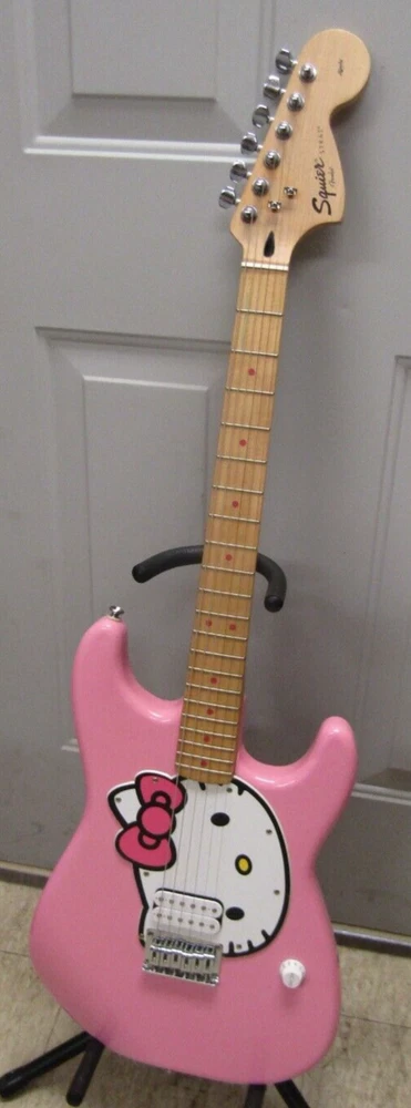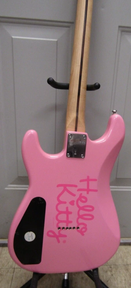 Squier Affinity Series Hello Kitty Strat Pink Electric Guitar Fender Strat, does have some dings on bottom, the plastic protective covering is on the front and back still, see pictures for condition Hello Kitty® Stratocaster®, Maple Fingerboard, Pink Model #: 0335005570 Case/Gib Bag: None Product Specs Body Agathis Body Finish Gloss Polyurethane Body Shape Stratocaster® Bridge 6-Saddle Standard Strings-Through-Body Tele® with Block Saddles Color Pink Configuration H Control Knobs Black Plastic Controls Master Volume Country Of Origin ID Dimensions 4.00x14.50x44.50 IN Fingerboard Maple Fret Size Medium Jumbo Hardware Finish Chrome Model Name Hello Kitty® Stratocaster®, Maple Fingerboard, Pink Neck Finish Satin Urethane Neck Material Maple Neck Material Maple Neck Shape "C" Shape Number of Frets 21 Nut Material Plastic Nut Width 1.61" (40.9 mm) Orientation Right-Hand Pickguard None Pickup Configuration H Pickup Switching None Position Inlays Black Dot Refinement Neck Material Maple Scale Length 25.5" (64.77 cm) Series Hello Kitty® String Nut Plastic Strings Fender® USA 250L Nickel Plated Steel (.009-.042 Gauges), PN 0730250403 Tuning Machines Standard Die-Cast