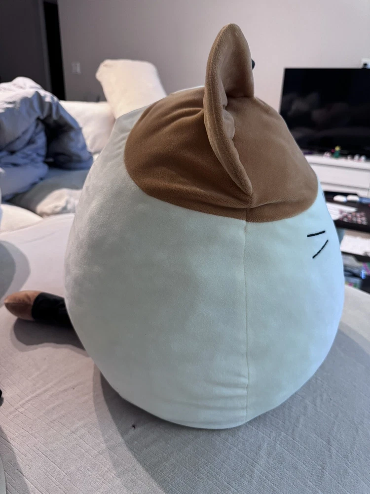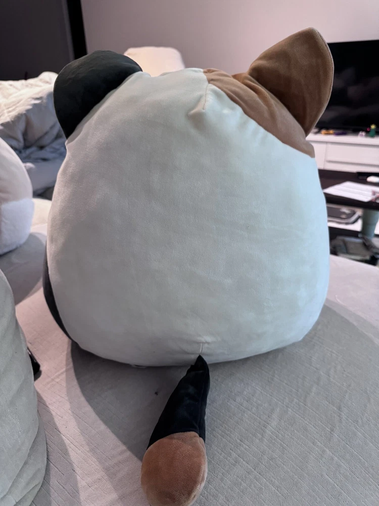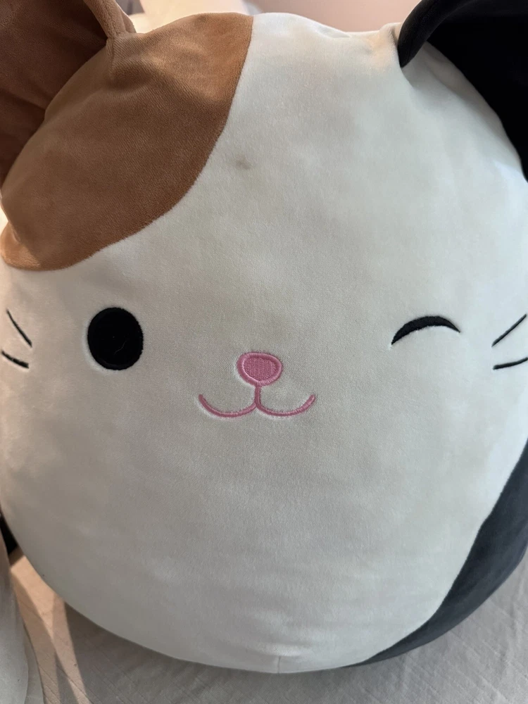 This is a Squishmallow Cameron Cam The Calico Cat plush toy from 2017. It is a medium-sized (16 inches) stuffed toy with a unique feature of one open eye winking. The cat design is in multi-colors and is recommended for ages 0-17 years. This plush toy is a rare find and a cute addition to any collection.