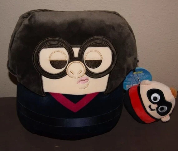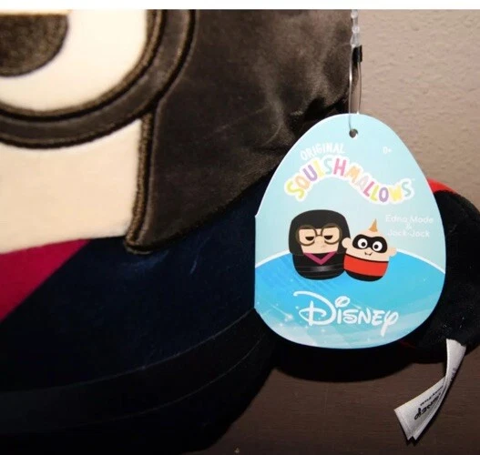This product is a 10-inch Squishmallow featuring the character Edna from Disney Pixar's The Incredibles, with a 5-inch attached Jack Jack. It is part of the Disney franchise and was manufactured in China in 2022. The Squishmallow is brand new with tags, making it a collectible plush toy.