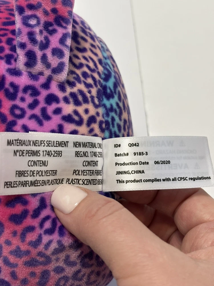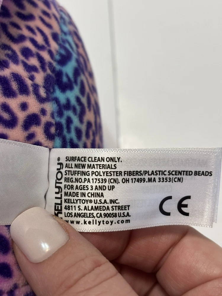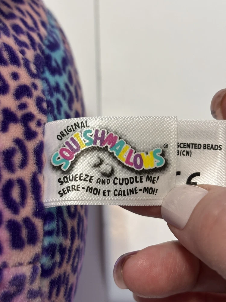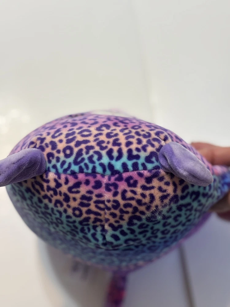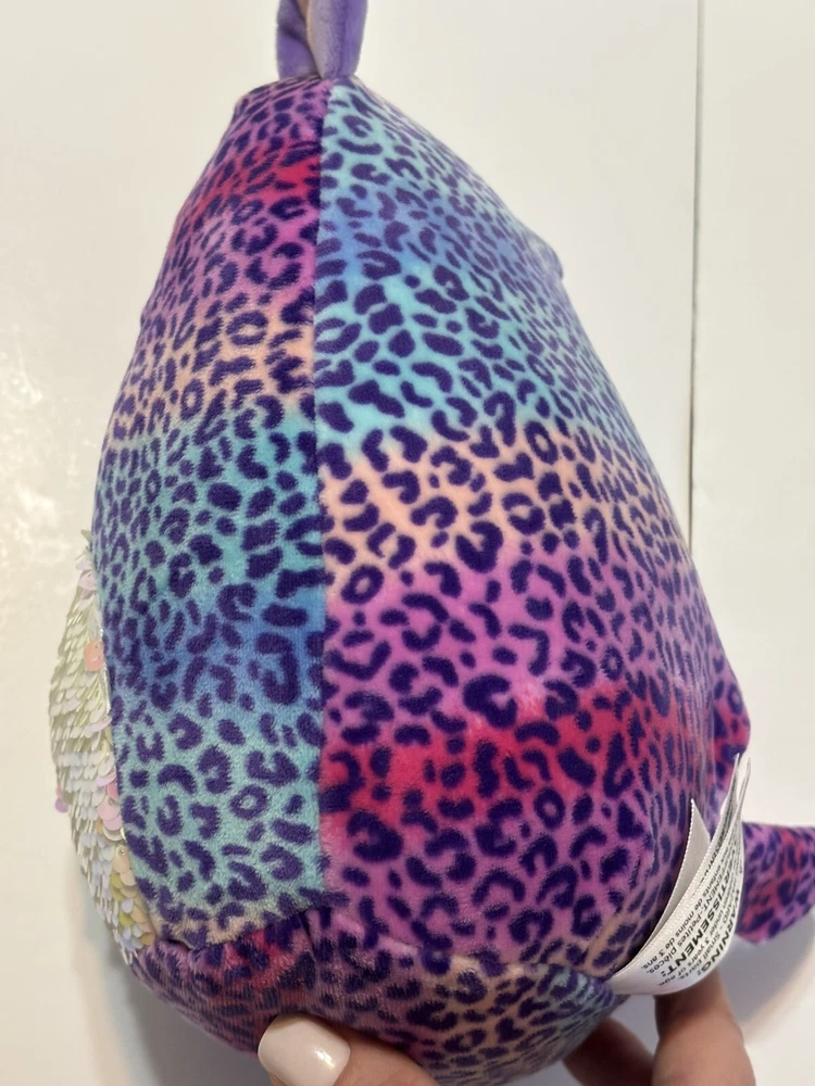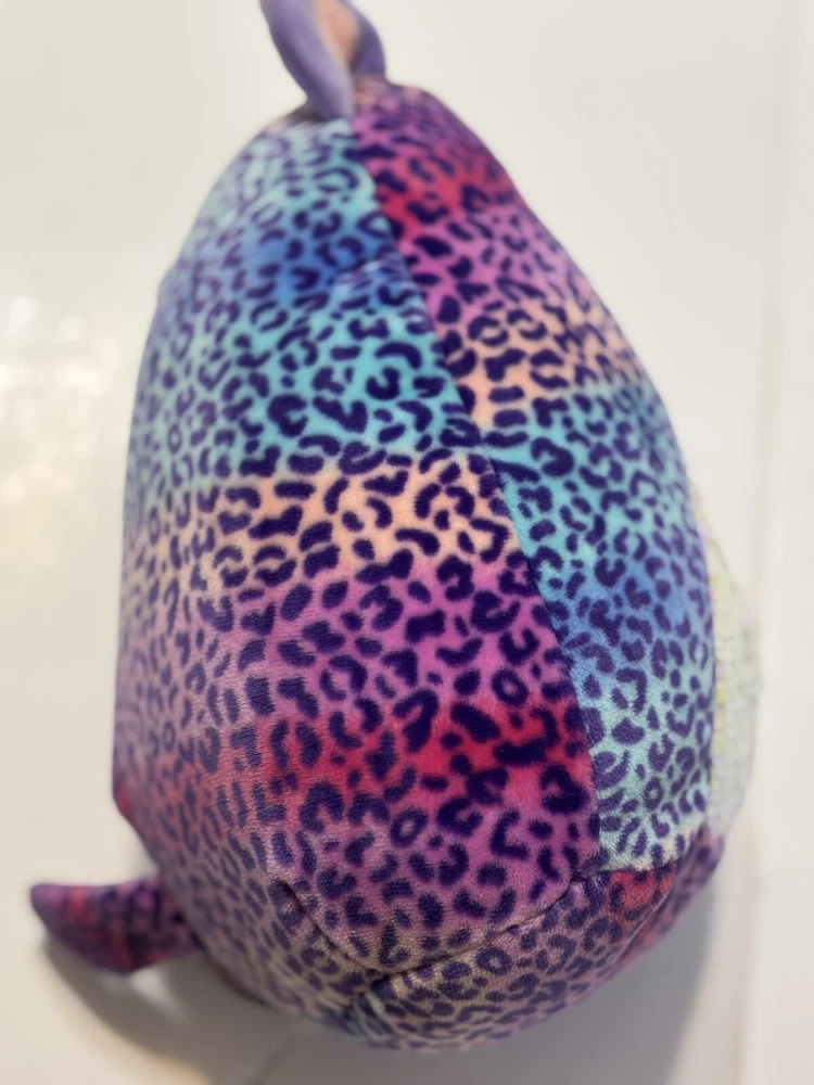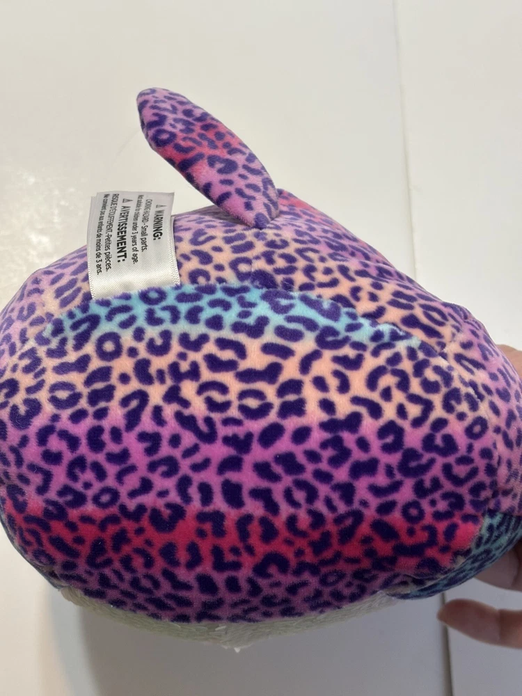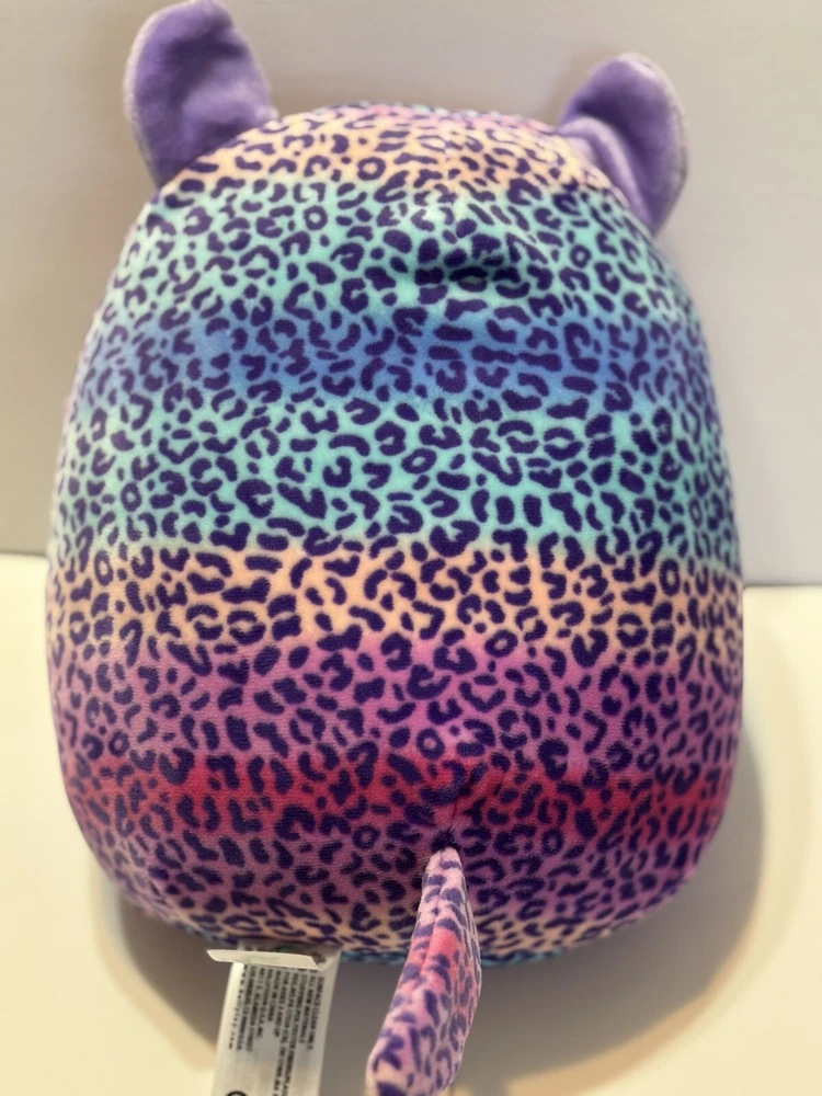 The product is a Squishmallow plush toy named Kat the Leopard, measuring 8 inches. It features a sequined belly and is designed in a multicolor pattern. Ideal for ages 3-4, this small stuffed animal is a cute and cuddly addition to any toy collection, perfect for all occasions. In excellent preloved condition, there are no flaws of any kind. Please see all attached photos.