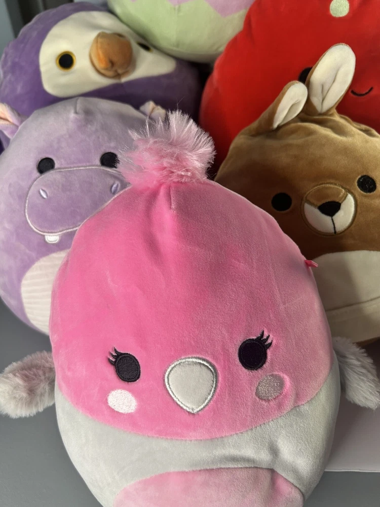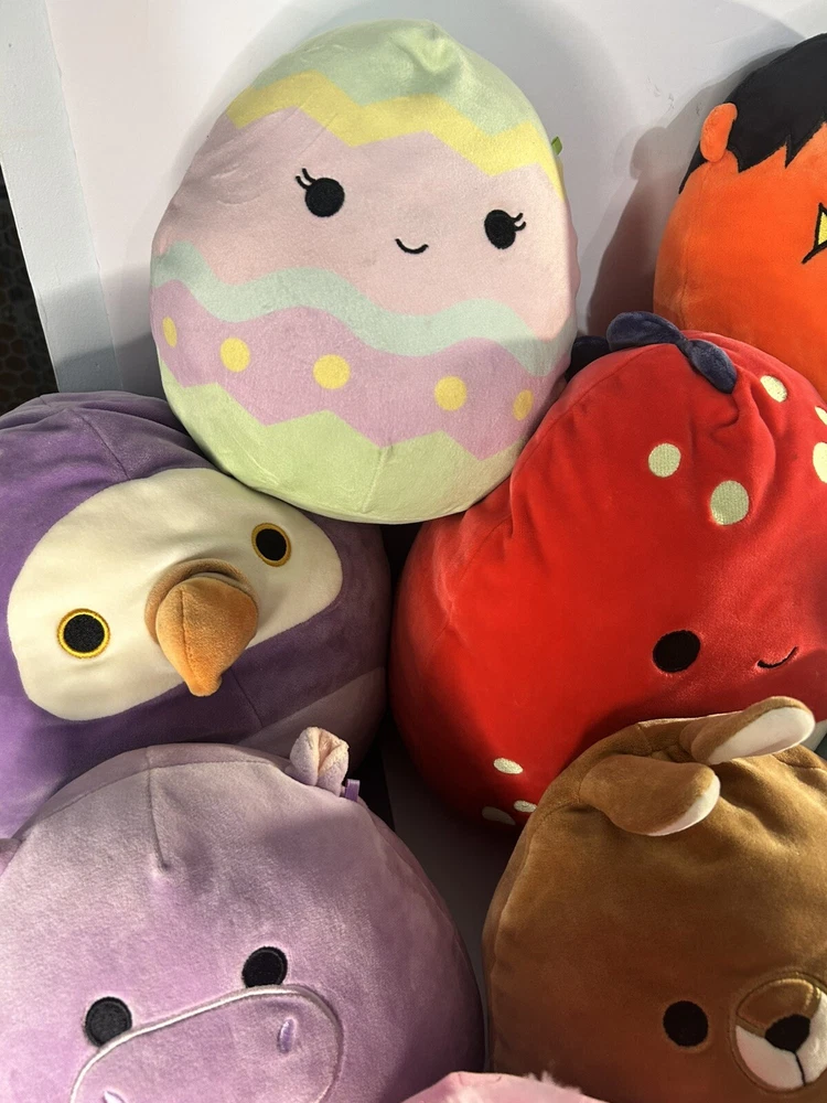 The Squishmallow lot consists of various sizes of stuffed animals, including monsters, unicorns, and other collectibles.
