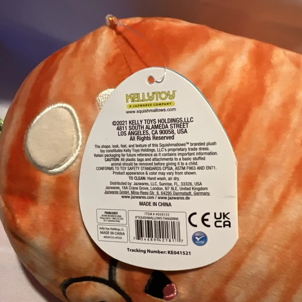 This Squishmallows plush toy is a must-have for fans of the popular brand. The Judy the Tangerine toy is part of the 2020 collection by Kellytoy and features a colorful tie-dye design that is perfect for summer and beach-themed occasions. Measuring 8 inches in size, this small plush is scented, retired, and washable, making it a great addition to any collection. The Squishmallows plush is recommended for ages 3 and up and is perfect for young children and collectors alike. Made in China, this toy belongs to the Squishmallow character family and would be a great addition to anyone's stuffed animal collection.