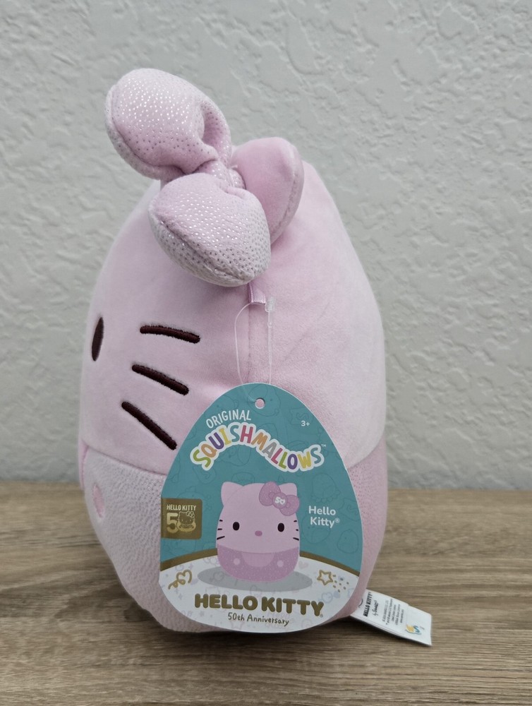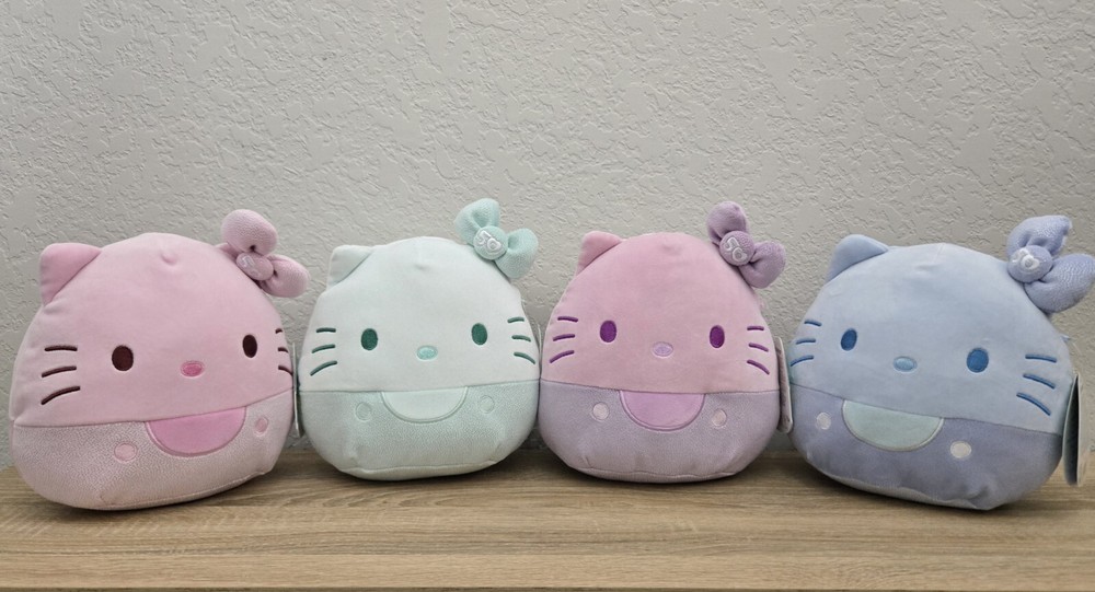 *Free shipping with USPS Ground Advantage. Ships ASAP. Packaged with care. Smoke-free home.* Introducing the Squishmallows HELLO KITTY 8" Pastel Plush, a collectible item from the brand's 50th Anniversary celebration. This adorable plush toy set features the iconic Hello Kitty character in a beautiful rainbow of pastel color, with a small size of 8 inches. The colors are baby pink, mint green, light lilac, and baby blue. It is recommended for children aged 3 and above, and is perfect for all occasions. The plush is hand-washable and comes with a complete set of 4, making it a great addition to any collection. It is made in China. Get your hands on this limited edition Squishmallows plush and celebrate the 50th anniversary of Hello Kitty!