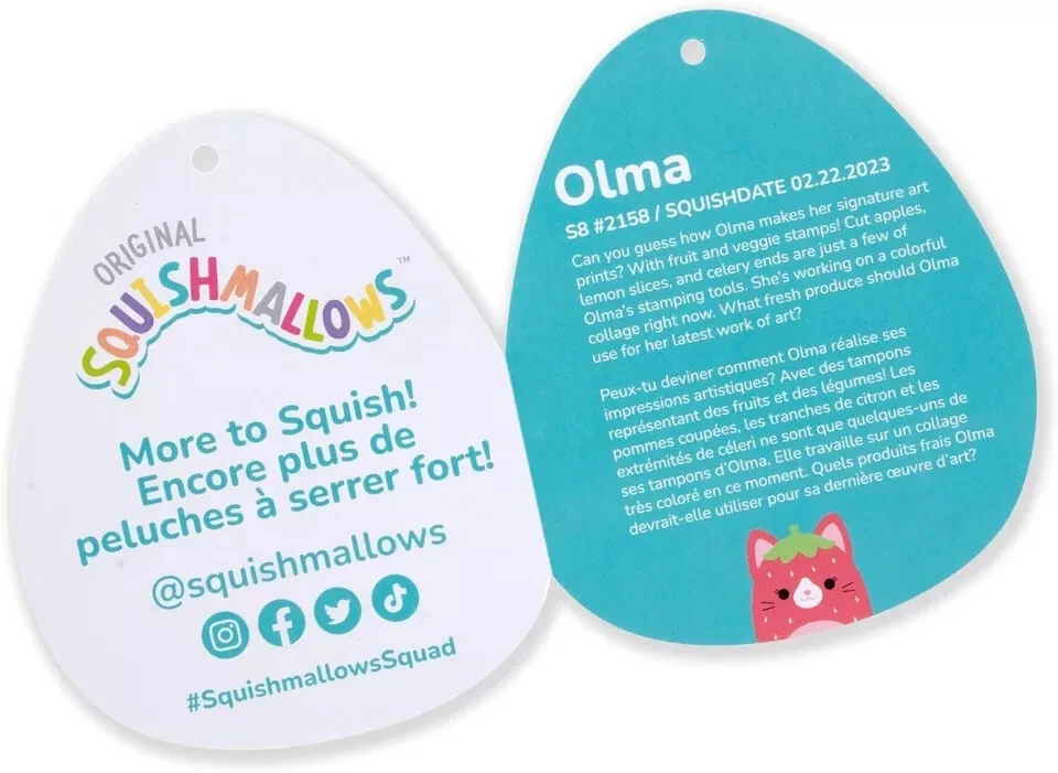 Squishmallows Original 12 Inch Olma Strawberry Cat Official Jazwares Plush NEW Specification Material Type Polyester Theme Animal Subject Character Animals Number of Pieces 1 Is Autographed No Model Number SQCR05542 Outer Material Polyester Package Type FFP Model Name Style 9 Toy Figure Type Stuffed Toy Play Activity Location Tabletop Collection Name Extensions Additional Features Official product, ultrasoft and high-quality Mallow materials Is Assembly Required No Item Dimensions L x W x H 6"L x 8"W x 7.5"H Color Strawberry Cat Animal Theme Cat Edition Original Are Batteries Required No Inner Material Polyester 8.0 inches x 6.0 inches x 7.5 inches. Weight: 6.7 oz Item Description Official product - Look for the official seal and join the Squad! Olma makes her own stamps with fresh apples Hug your troubles away with our ultrasoft and high-quality ‘Mallow materials make great companions and come in a variety of personalities, sizes, and colors Collect into other extensions too, including FuzzAMallows, HugMees, Mystery Squad, and Stackables Can you guess how Olma makes her signature art prints? With fruit and veggie stamps! Cut apples, lemon slices, and celery ends are just a few of Olma’s stamping tools. She’s working on a colorful collage right now. What fresh produce should Olma use for her latest work of art?