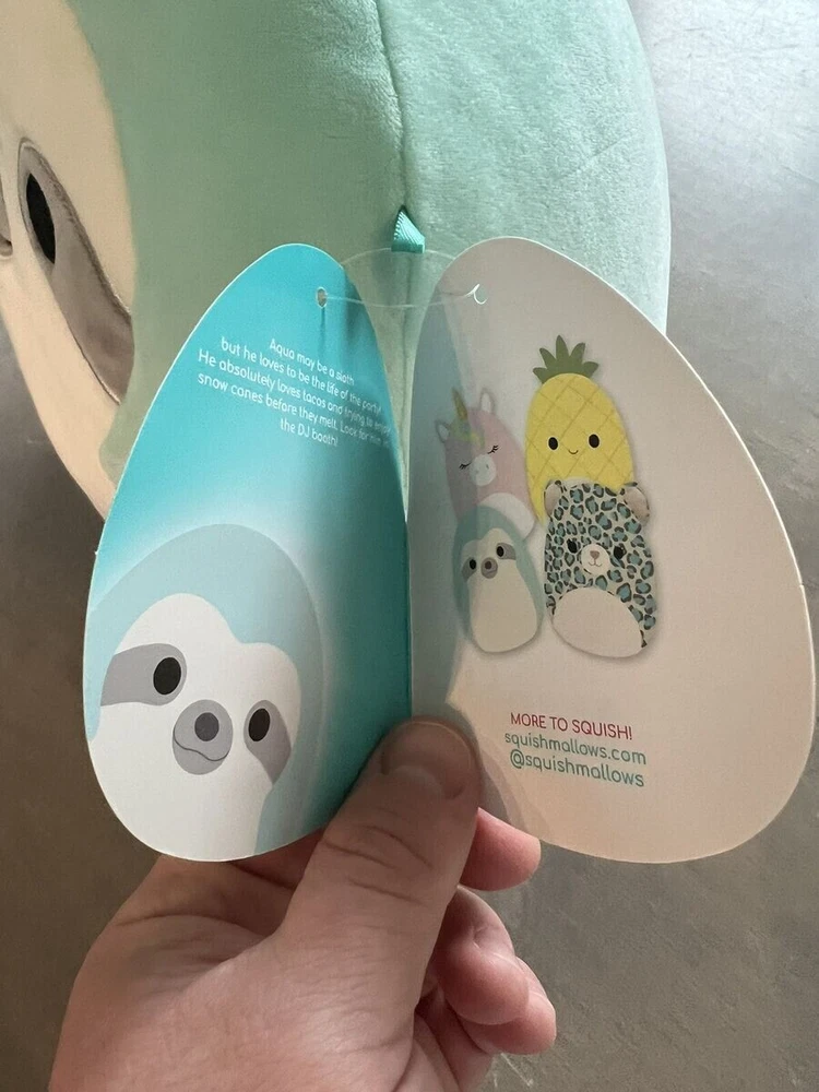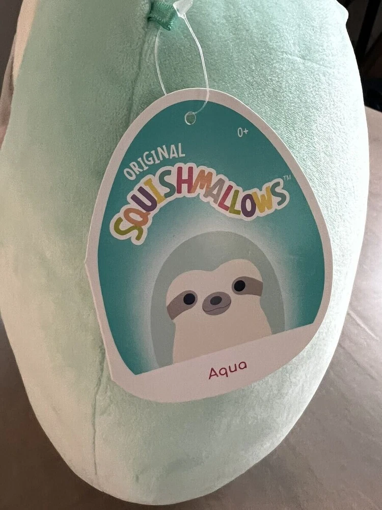 Condition: NEW WITH TAGS Squishmallows Original - Aqua the Sloth - 12-Inch Stuffie Aqua may be a sloth but he loves to be the life of the party! He absolutely loves tacos and trying to enjoy snow cones before they melt. Look for him in the DJ booth! Aqua is a sloth with a pale aqua body and a white patch on his face and belly. The banded markings around his eyes and his muzzle are pale gray. He has round eyes, a round nose and a cat-like smile, all of which are black. Each Squishmallow has its own unique name and bio found inside the hangtag. Squeeze your Squishmallows anytime you need an energy boost, during a scary movie, or on a long flight. Will you join the Squad? · If it doesn't say official Squishmallows product, it's not the real thing. Look for our official seal and join the Squad · Hug your troubles away with our ultrasoft and high-quality ‘Mallow materials · Squishmallows are friends and come in a variety of personalities, sizes, and colors · Collect into Squishmallows extensions too, including FuzzAMallows, HugMees, Mystery Squad, and Stackables only by Original Squishmallows