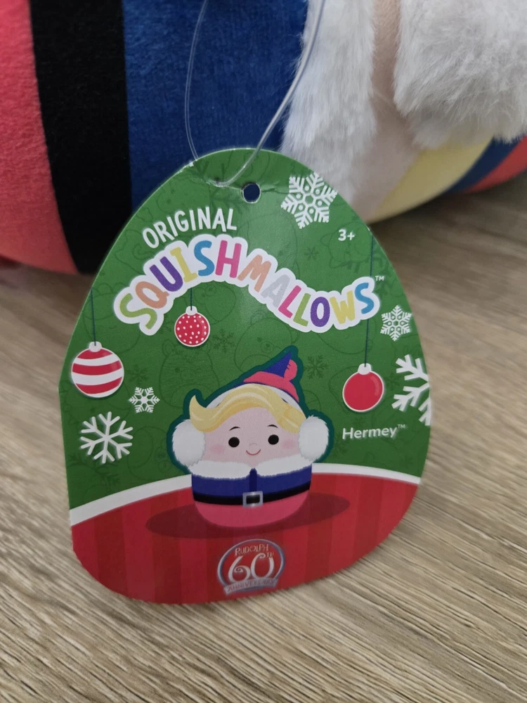*Free shipping with USPS Ground Advantage. Ships ASAP. Packaged with care. Smoke-free home.* This is a Squishmallows plush toy featuring Hermey from Rudolph The Red-Nosed Reindeer 60th Anniversary collection. The small-sized (6.5") plush toy is multicolored and designed for Christmas. It is soft, brand new with tags, and recommended for ages 3 and up. This collectible toy can be hand-washed and is made in China. Please note the imperfections on the hanging tag as shown in the attached pictures.