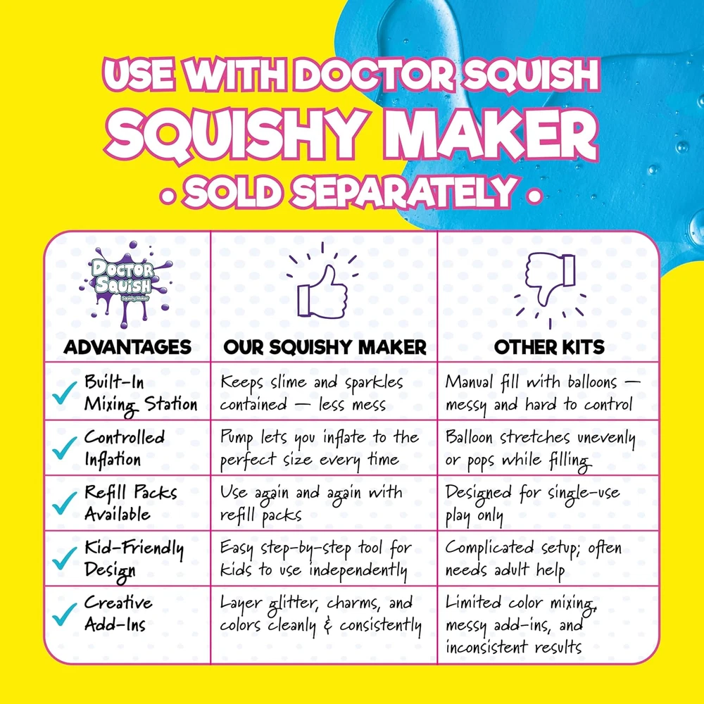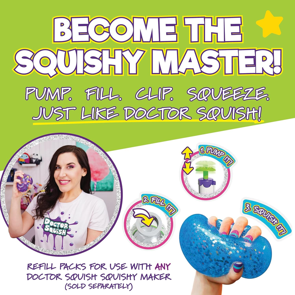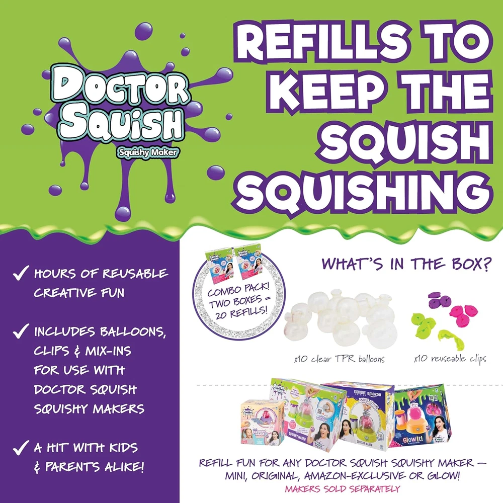 COMPLETE REFILL KIT: Restock your supplies with 10 clear TPR squishies and 10 reusable clips. This squishy maker refill pack works with the Doctor Squish squishy maker kit to keep the creativity flowing. Note: Squishy Maker not included. DIY SQUISHY FUN: Designed for use with the Doctor Squish squishy maker, this refill set lets kids keep creating. Make your own squishies of different sizes, decorate them with sparkles or confetti, and enjoy unlimited fun. CREATE COLORFUL DESIGNS: Add glitter, confetti, or ribbons (sold separately) to design unique squishies. This DIY squishy kit helps kids express their imagination while crafting stress balls and squishy toys they can squeeze and enjoy. PERFECT FOR ALL AGES: Whether you’re just starting or already a squishy fan, this refill kit is ideal for kids ages 8 & up. A fun make your own squishy kit that sparks creativity and makes a thoughtful gift for birthdays or holidays. MAKE SMALL TO GIANT SQUISHIES: With flexible TPR balloons and reusable clips, kids can design small, medium, or giant squishies. This squishy making kit refill allows endless experiments in shapes, textures, and sensory play. Product description What’ Up Guys? It’s Doctor Squish. Do you want to make your very own squishies at home? Now you can make ‘em all on your own, just like me: Doctor Squish! My squishy maker comes with everything you need to make your own awesome squishies! Use the Squishy Maker to create your very own squishies Use the Squishy Maker to create your very own squishies – just use the pump on the Squishy Maker to inflate the squishy until it’s the size you want your squishy to be, then fill it up with whatever you like! DIY Squishy Fun! Use the content of this set or your own stuff to create an awesome squishy. Close the squishy with the reusable clip and squeeeze! Awesome crazy squishies? You can do it! Whether you’re making big squishies or little squishies, you’ll have your hands full of squishy fun with my Doctor Squish: Squishy Maker!