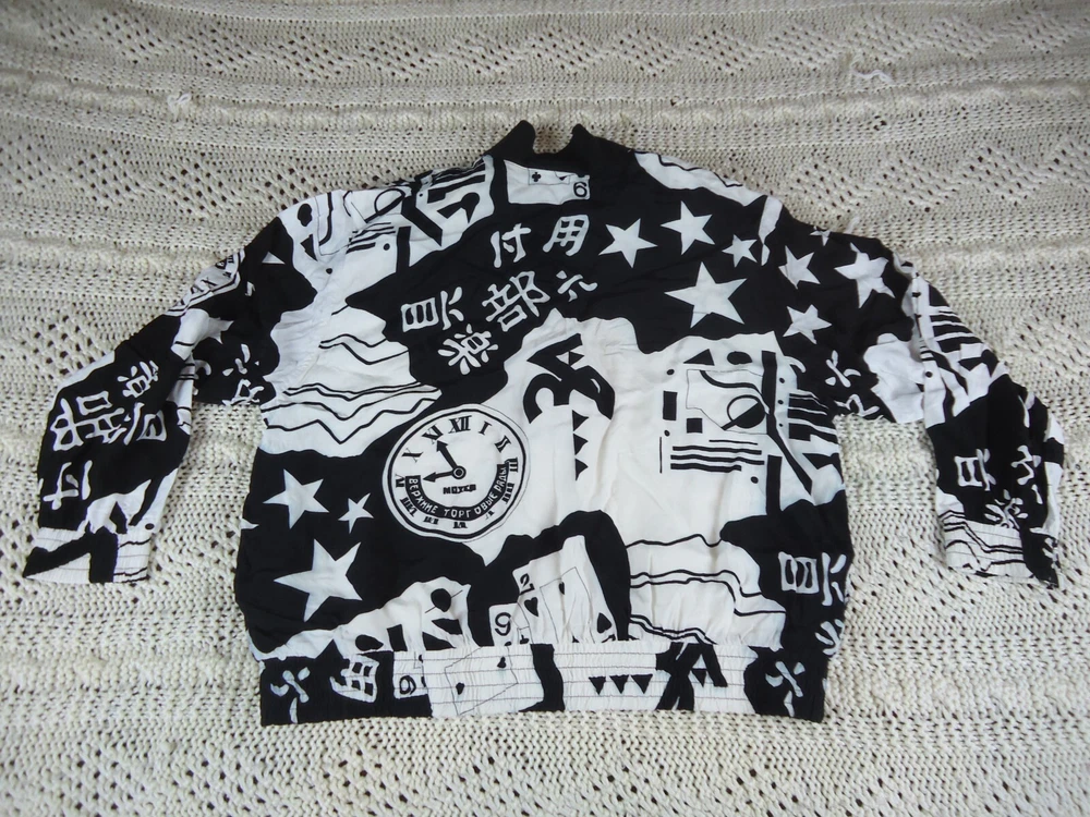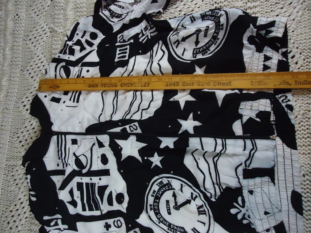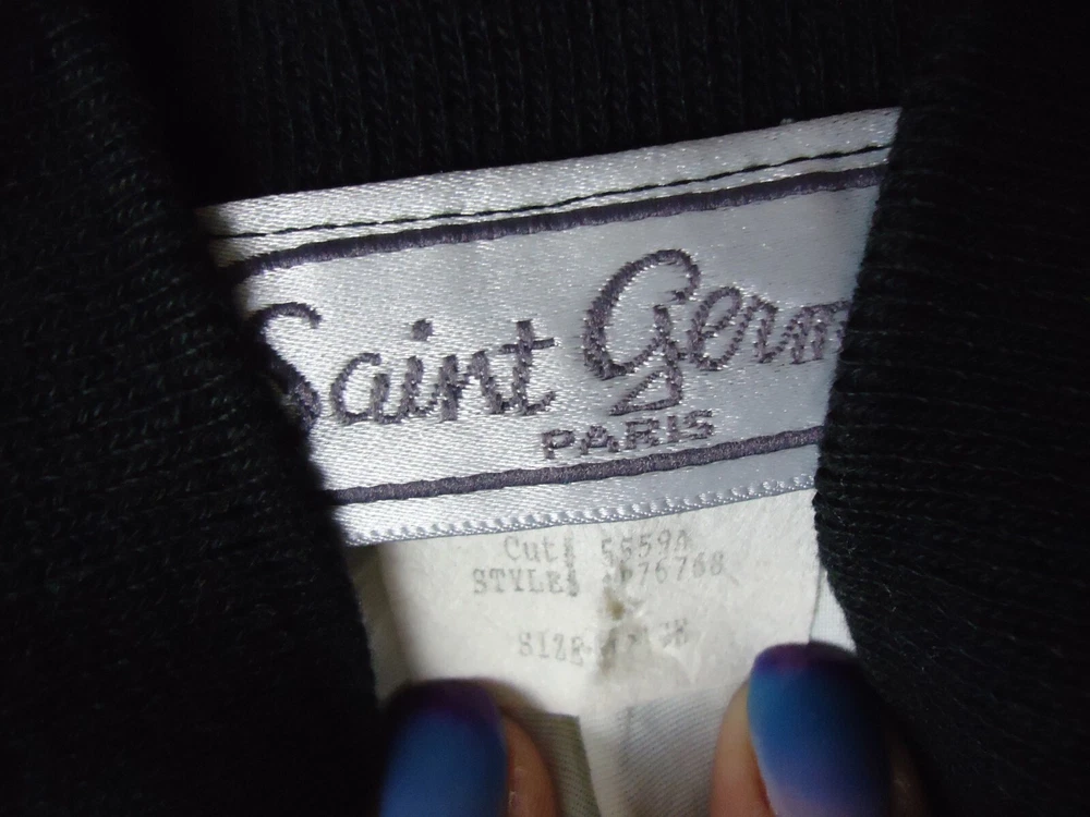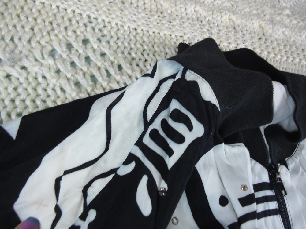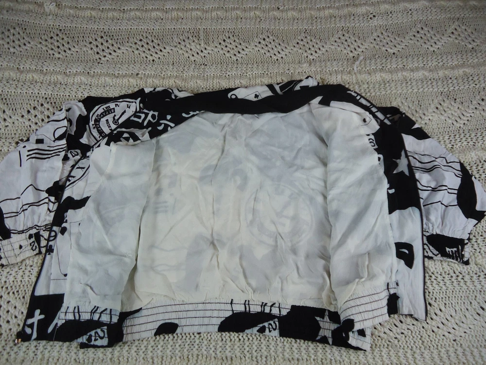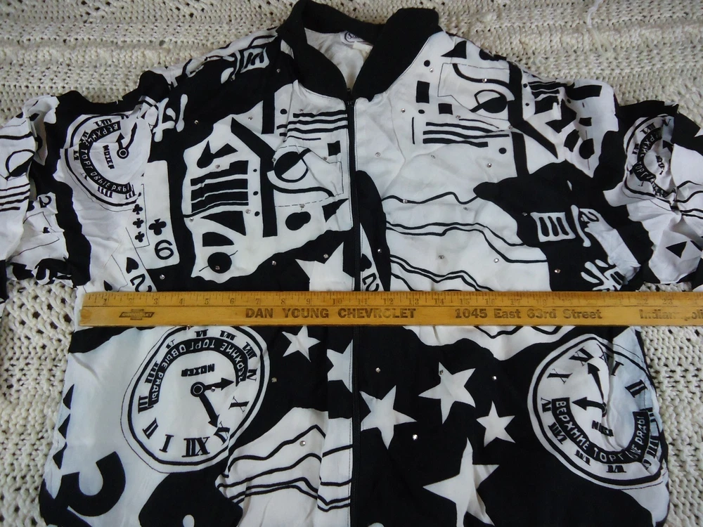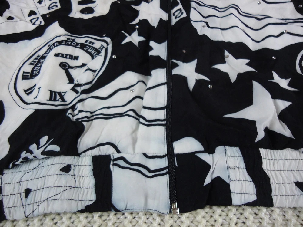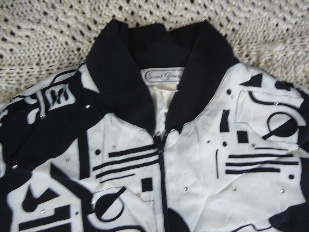 St. Germain Paris VTG Women's L Black and White Novelty Bling Bomber Jacket 90s. Dry Clean Only. Preowned and great overall condition. The white on the main body of the jacket is not quite as crisp as the white on the sleeves. Seems to be just the visible lining. Please see all pictures for measurements and condition. C5