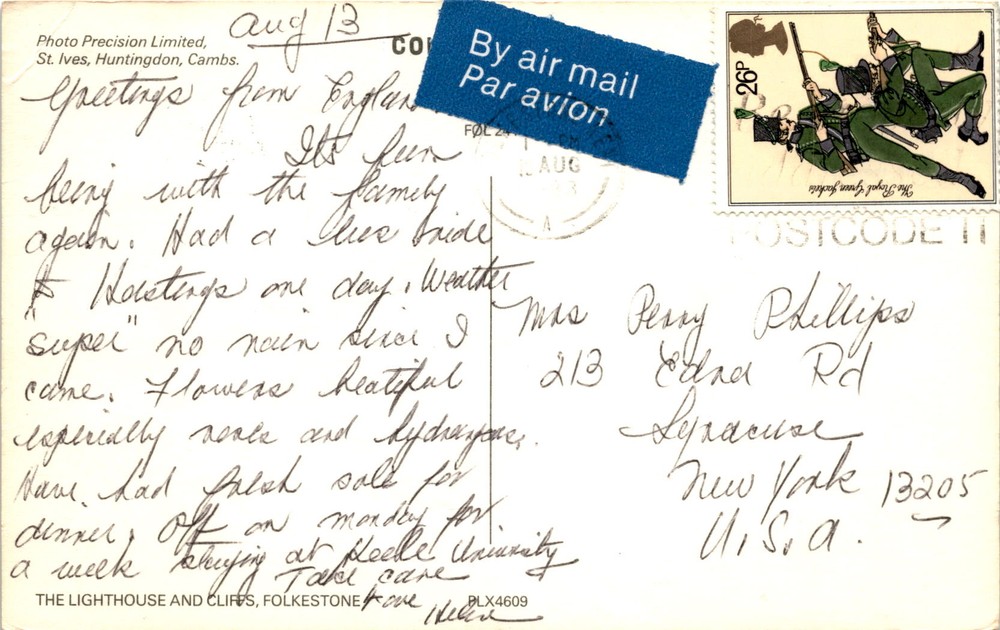 MAKE AN OFFER. THE MORE YOU BUY THE BETTER DEAL I WILL ACCEPT The postcard features a photo of The Lighthouse and Cliffs, Folkestone, taken by Photo Precision Limited in St. Ives, Huntingdon, Cambridgeshire, England. Folkestone is a coastal town in Kent, known for its cliffs and scenic views of the English Channel.