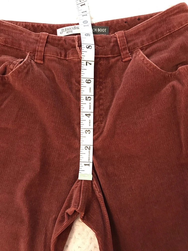 Rise: Mid (8.5-10.5 in) Front Type: Flat Front Type: Pants Leg Style: Bootcut Occasion: Casual, Party/Cocktail, Travel, Workwear Pattern: Solid Waist Size: 28 in Size: 6P Features: Comfort, Easy Care, Pockets, Stretch Inseam: 25 in Fit: Regular Style: Ankle Material: Cotton, Spandex Brand: St. John's Bay Closure: Button, Zip Color: Burnt Orange Rust Theme: Festival, Grunge, Nature, Retro Department: Women Fabric Type: Corduroy Season: Fall, Spring, Winter Size Type: Petites